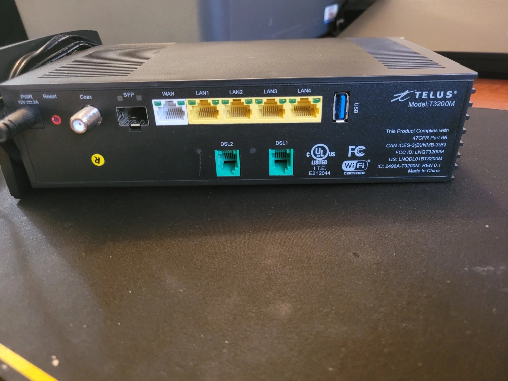 Used Telus T3200M Wi-Fi modem. Includes power adapter. Multiple LAN and DSL ports. Good condition.