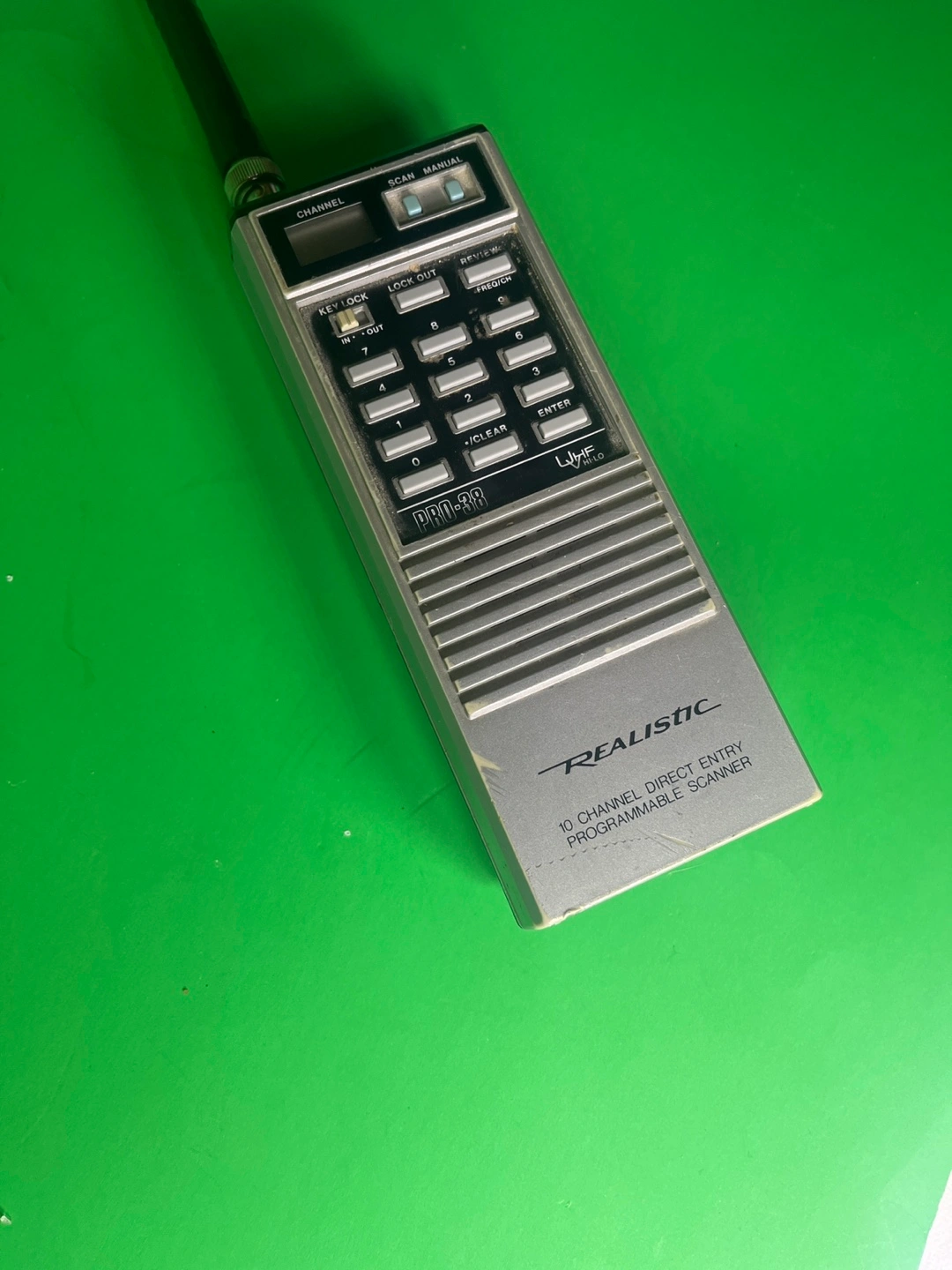 Retro handheld scanner. Features 10 channels, direct entry, and programmable scanning functions. Includes antenna. Shows some signs of age.