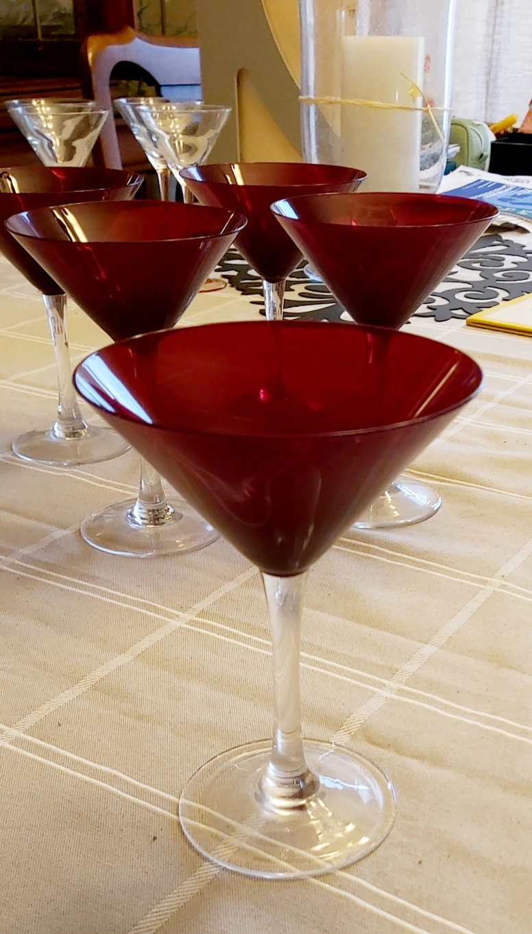6 beautiful ruby red martini glasses. Clear stems. Elegant design. Perfect for parties or special occasions.