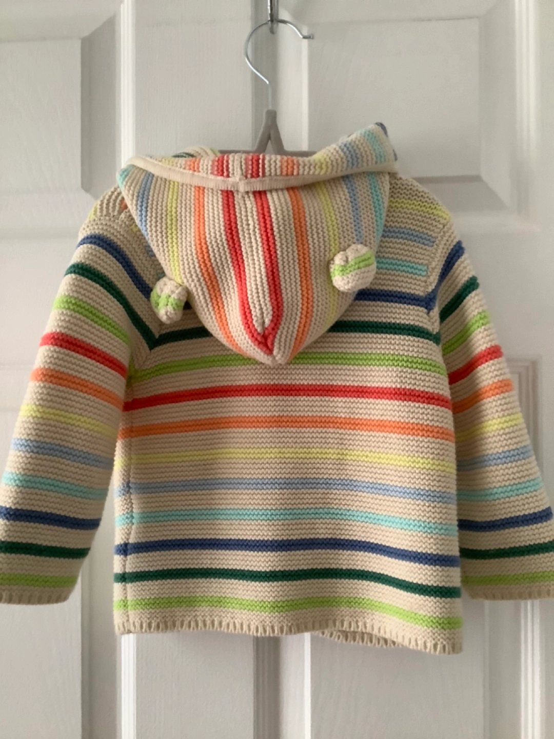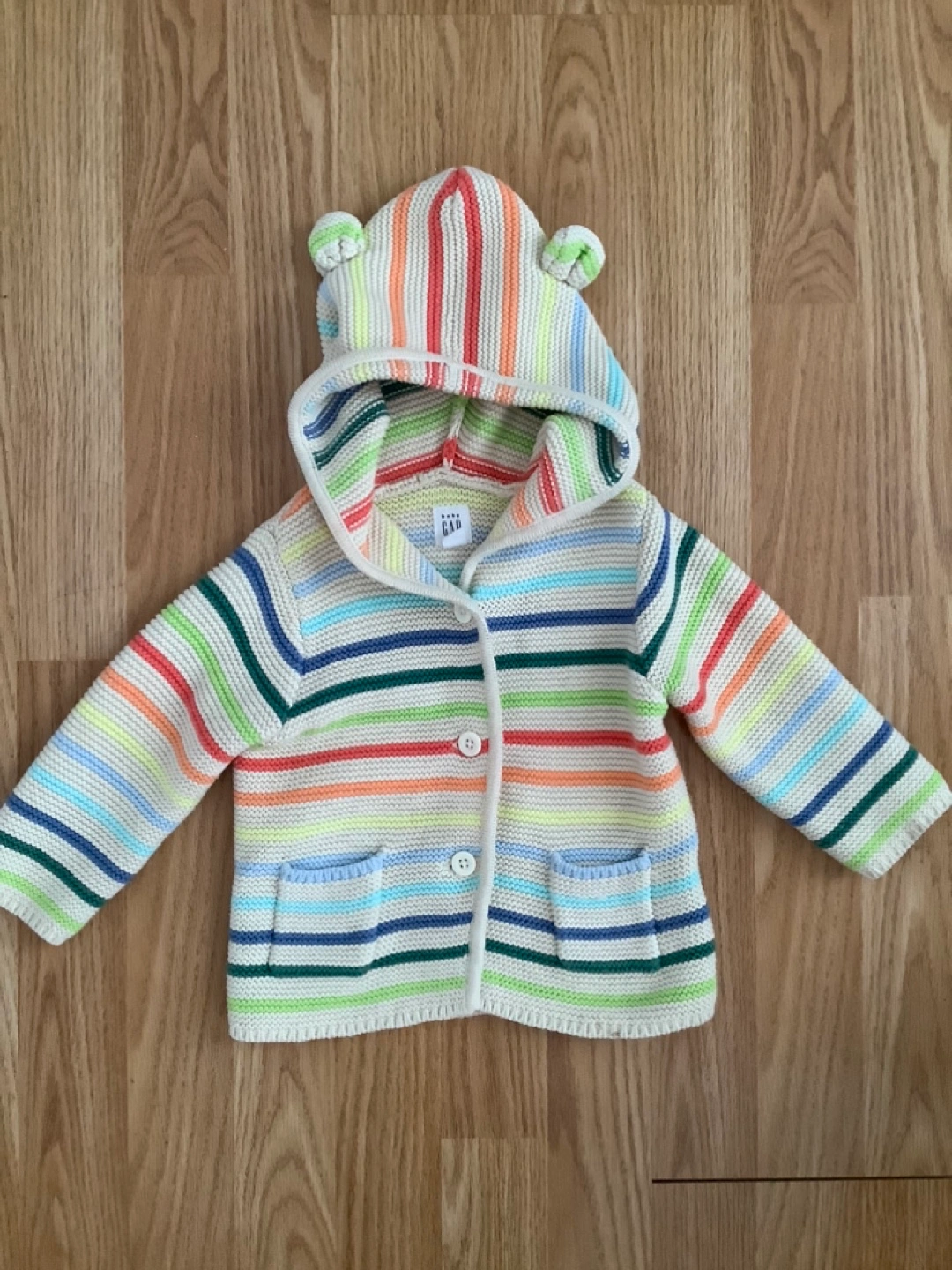 Adorable baby cardigan. Rainbow coloured stripes. Features a hooded design with cute bear ears. Button closure. Patch pockets. Perfect for spring or fall.