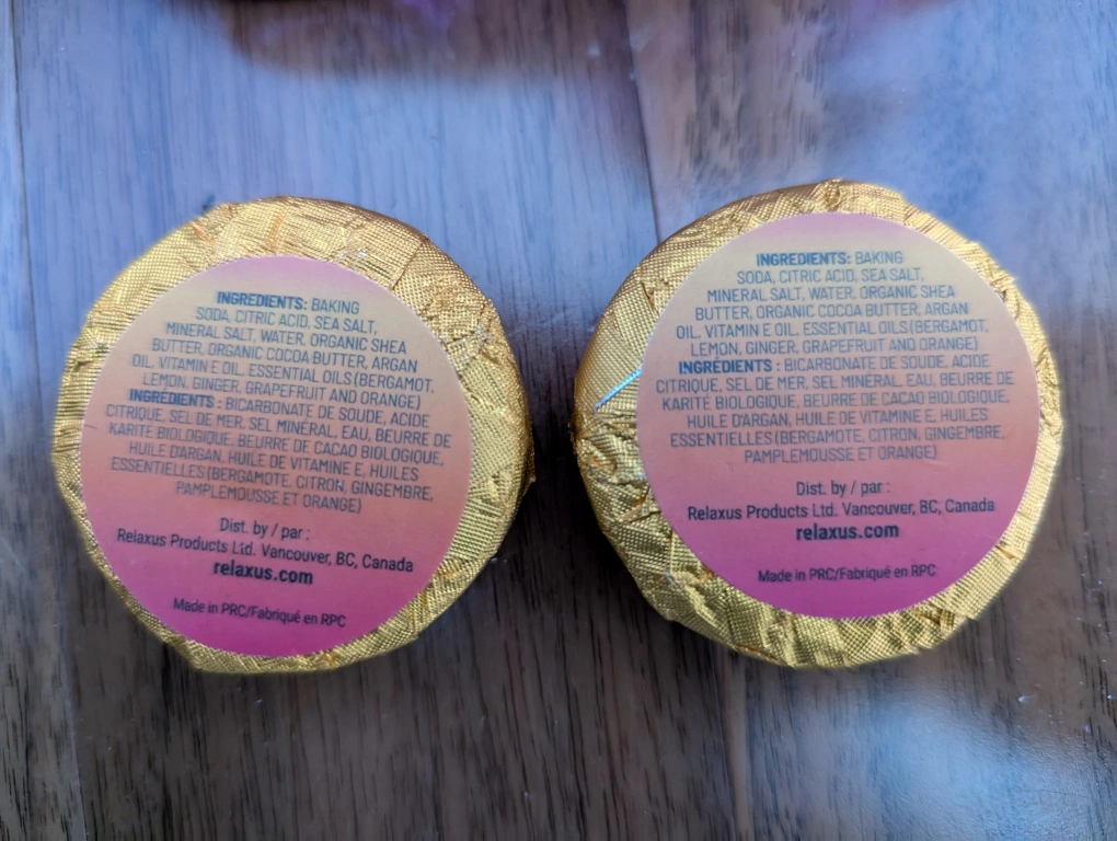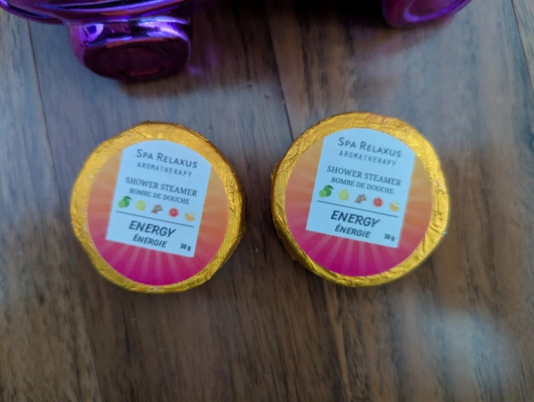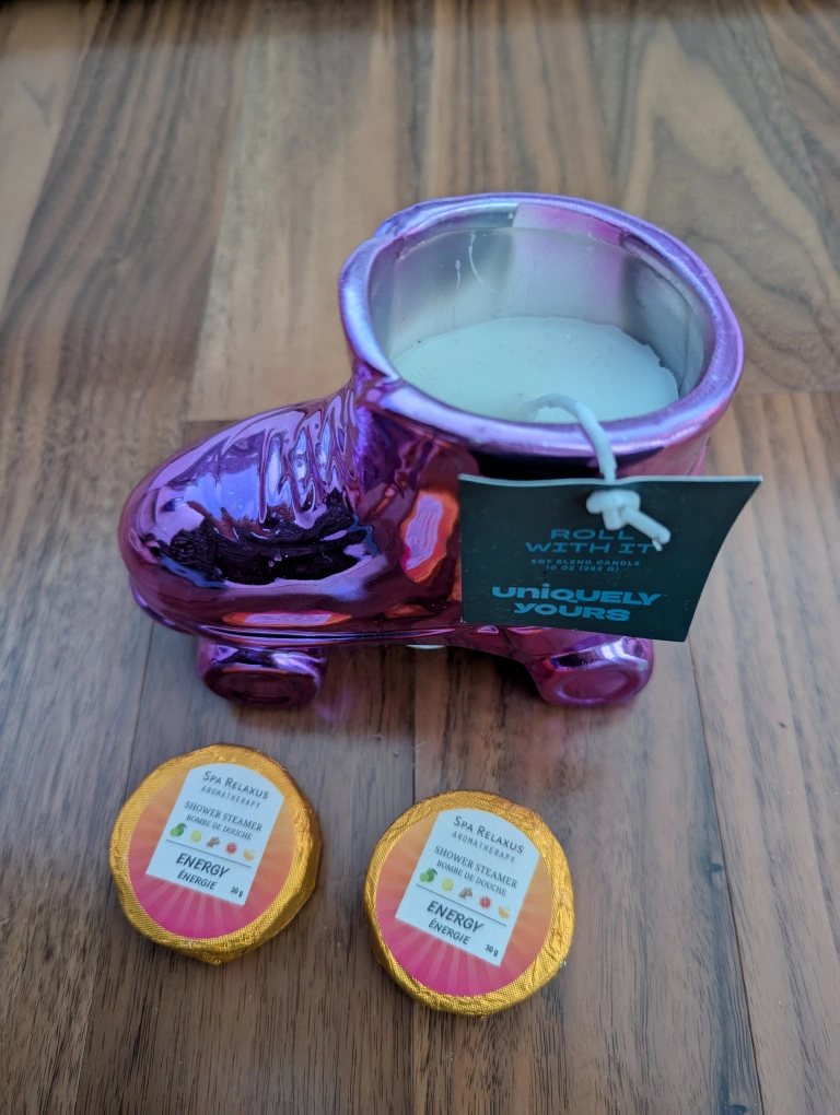 Two Relaxus Spa shower steamers, Energy scent, 30g each. Purple metallic roller skate sit blend candle, Uniquely Yours brand.