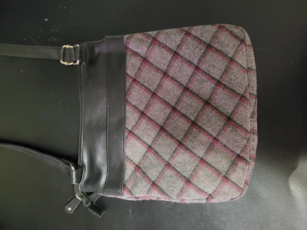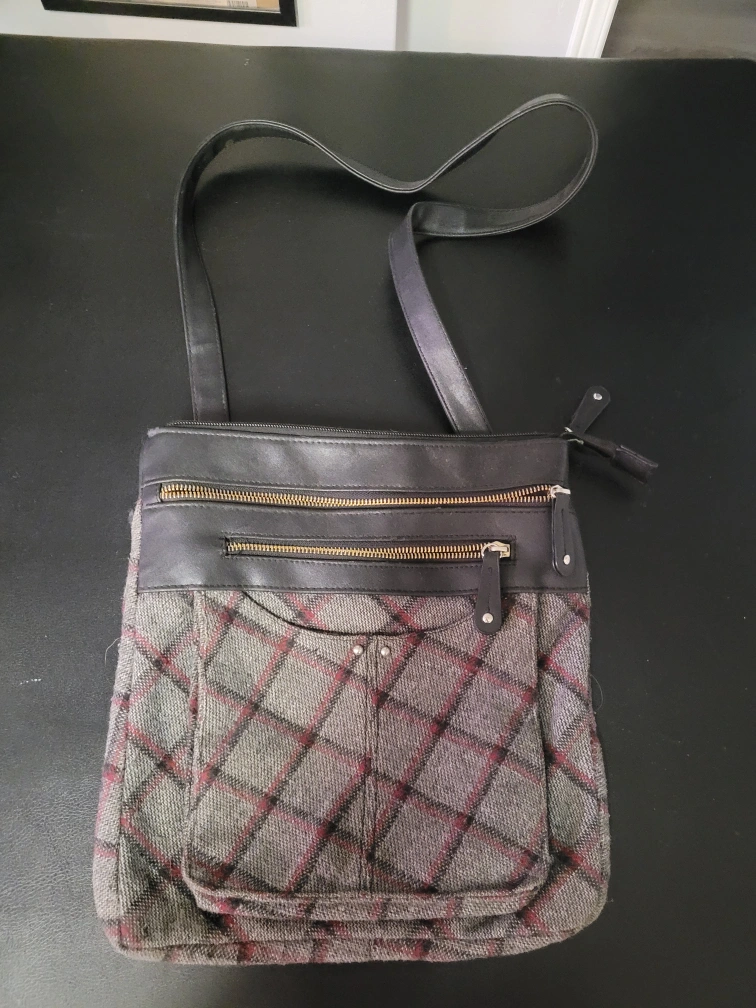 Stylish crossbody bag. Features grey and black tweed fabric, black leather accents. Multiple zippered compartments. Adjustable shoulder strap.
