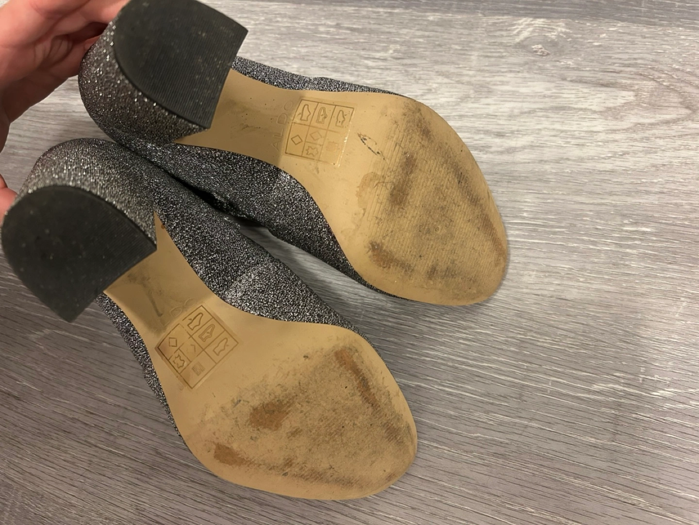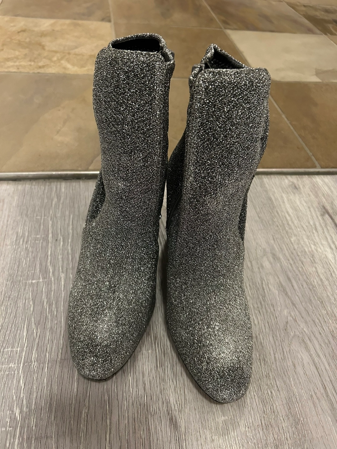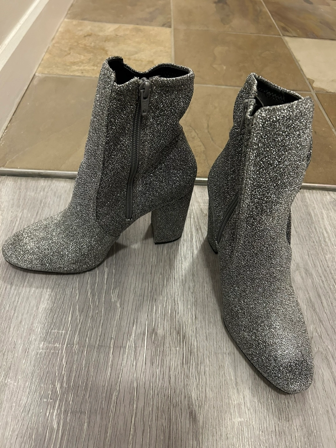 Gorgeous silver glitter ankle boots. Block heel. Side zip closure. Perfect for parties or special occasions.
