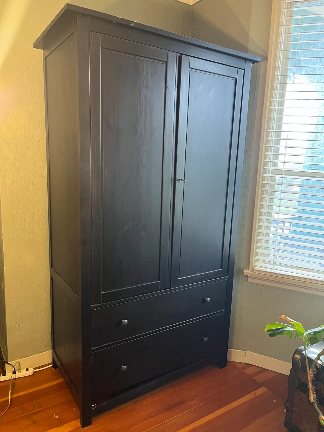 Tall dark brown IKEA wardrobe. Solid wood construction. Excellent storage solution! Two spacious drawers, one large shelf inside, as well as over 3ft across of hanging storage. It is over 6ft tall! Height 76” / Width 39.25” / Depth 22.75”. Pickup only near Oakland’s, it is heavy, must be able to take as is & move by yourself. $250! Reduced to $210.