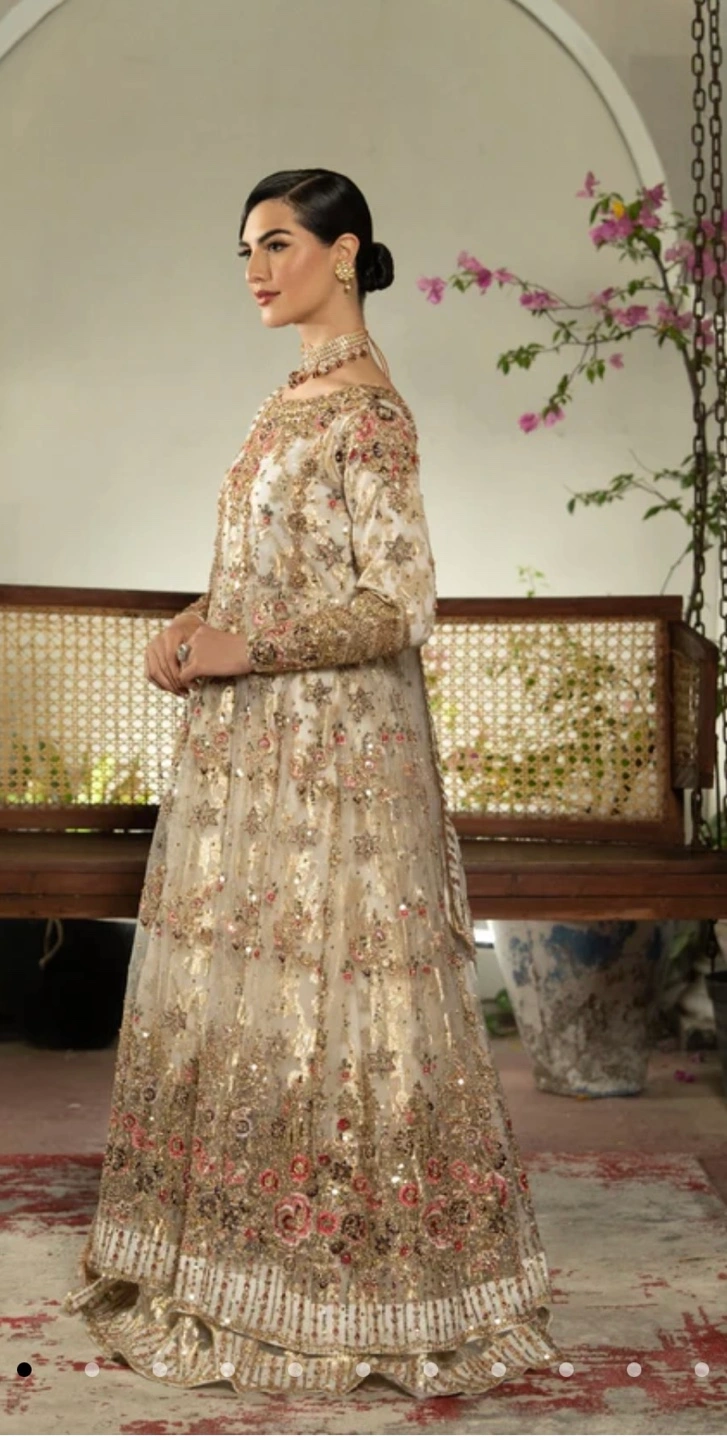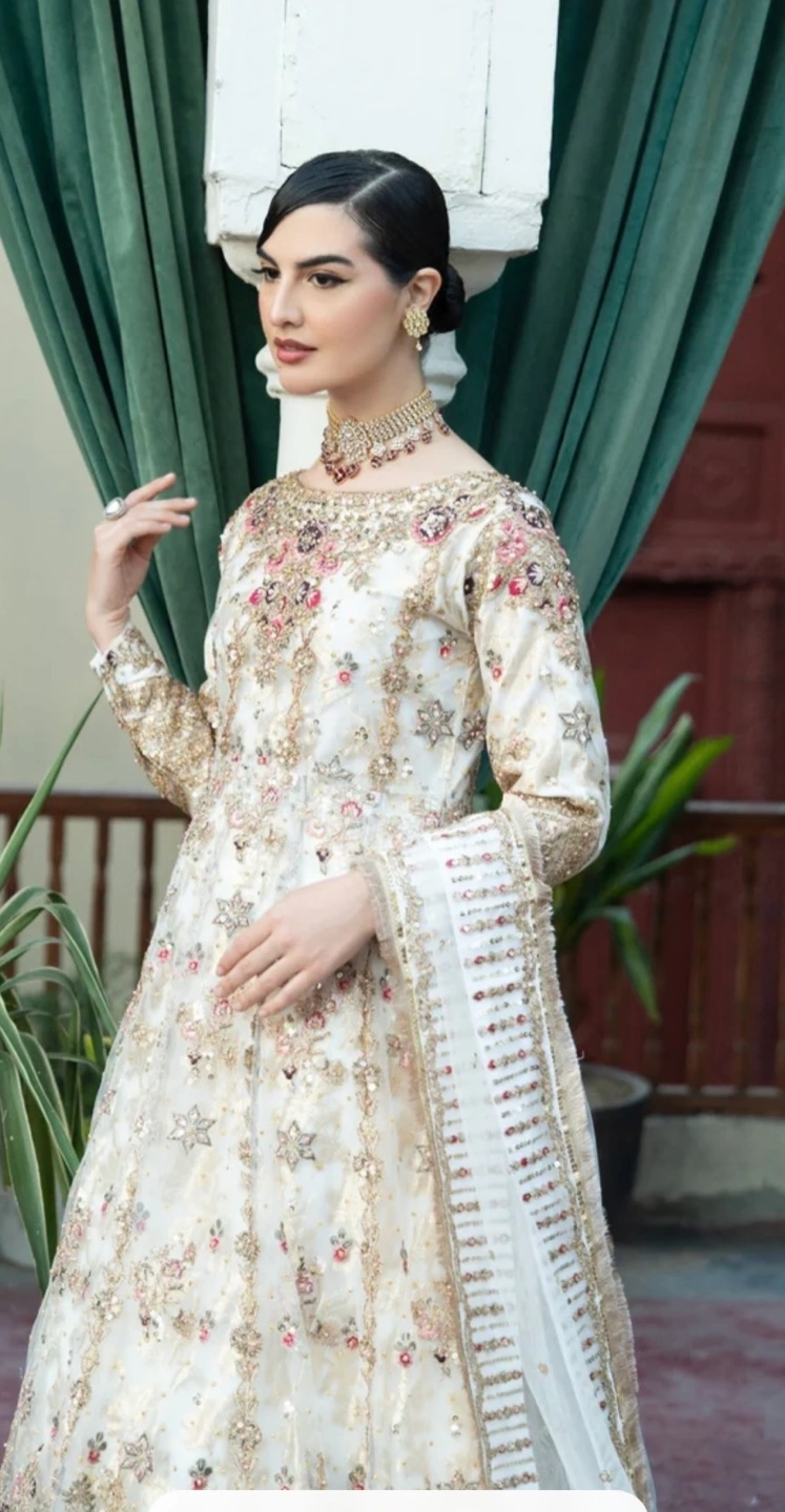 Stunning off-white maxi dress. Intricate gold and pink embroidery. Long sleeves. Floor-length. Matching dupatta. Perfect for special occasions. Brand new, tags still on.