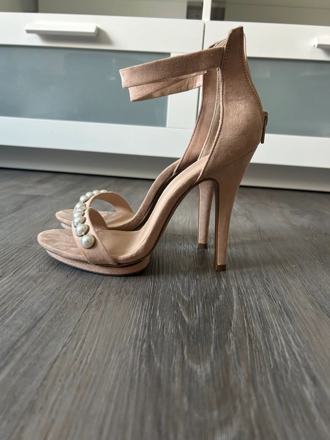 Nude-coloured suede heels. Ankle strap. Pearl embellishments. Size 8.