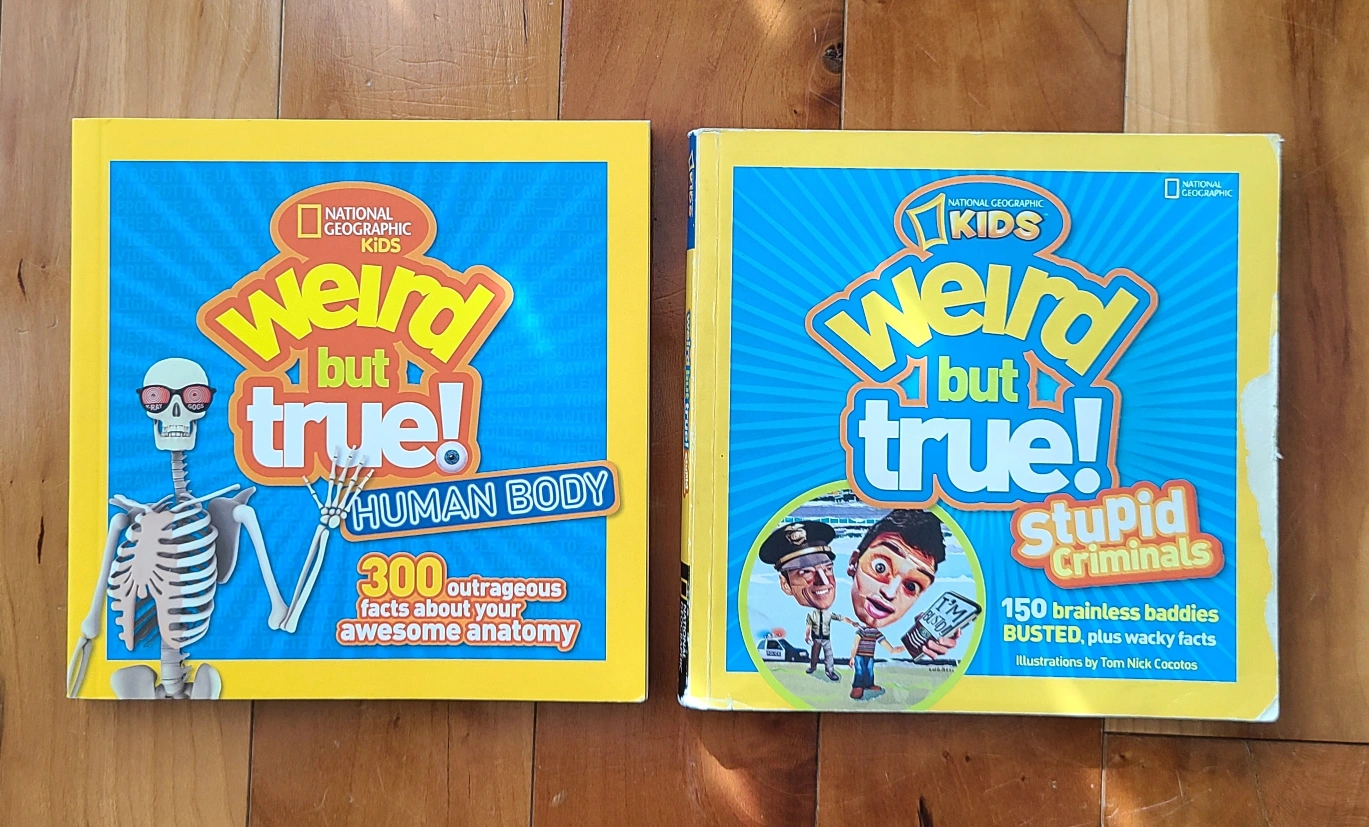 Two National Geographic Kids Weird but True! books. Human Body edition features 300 facts. Stupid Criminals edition features 150 brainless baddies.
