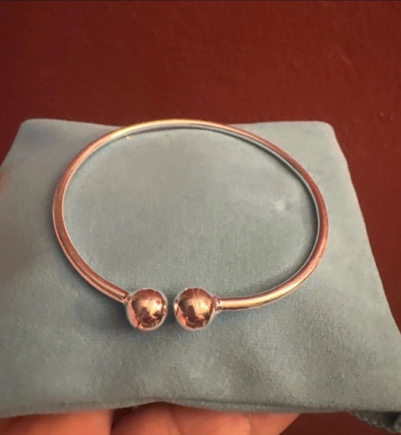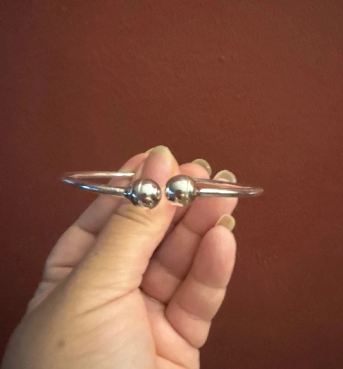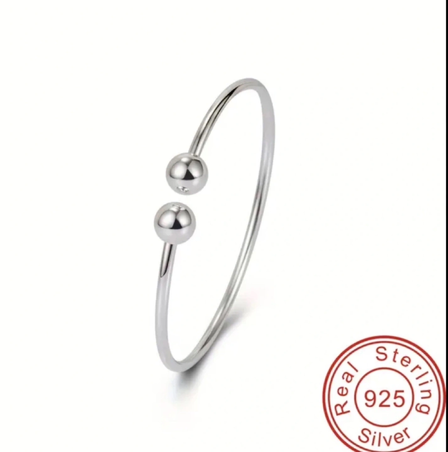 Simple 925 Sterling Silver bangle bracelet. Features two small balls. Open design. Looks elegant. Comes with pouch and cleaning cloth New