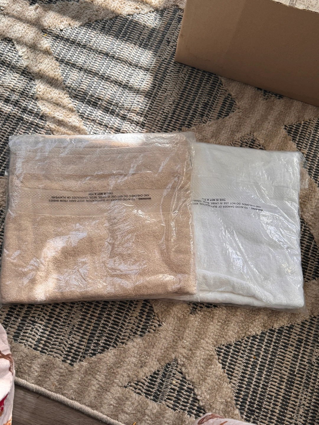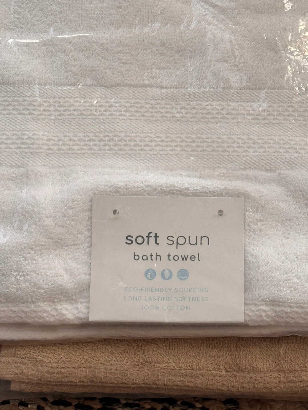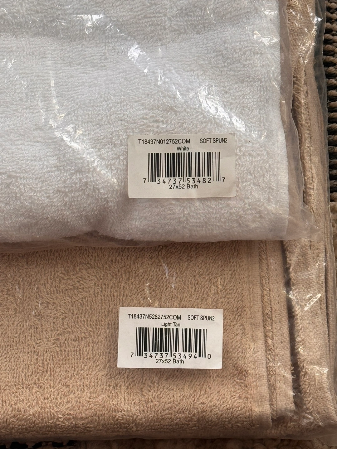 New bath towels, never used. One beige, one white. 100% cotton. Eco-friendly sourcing. Long-lasting softness.