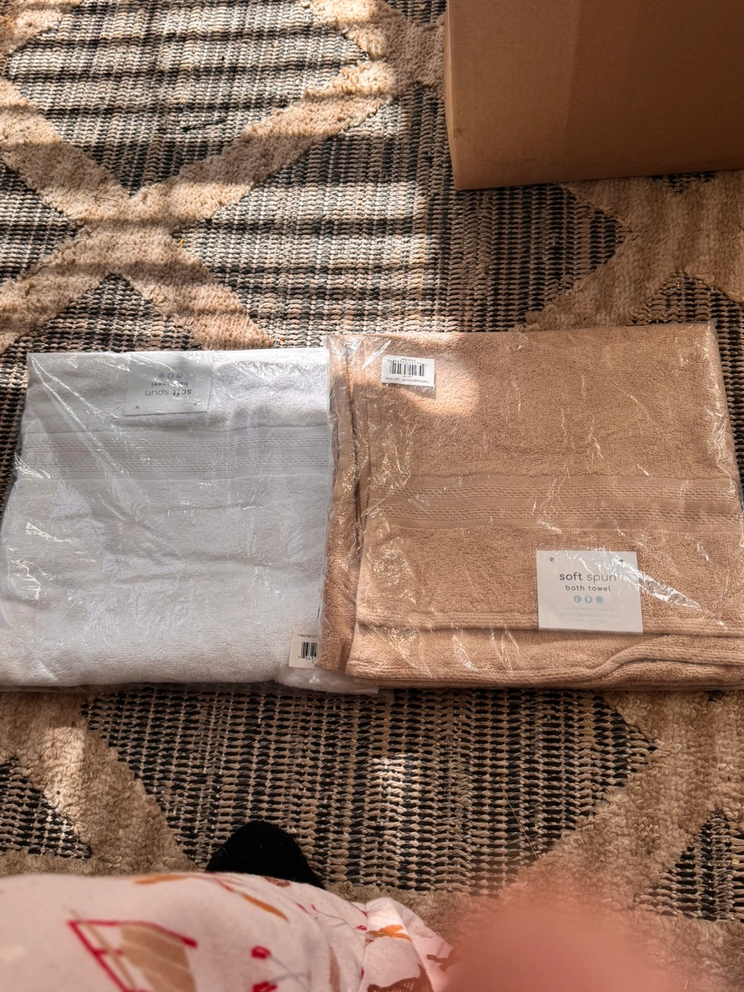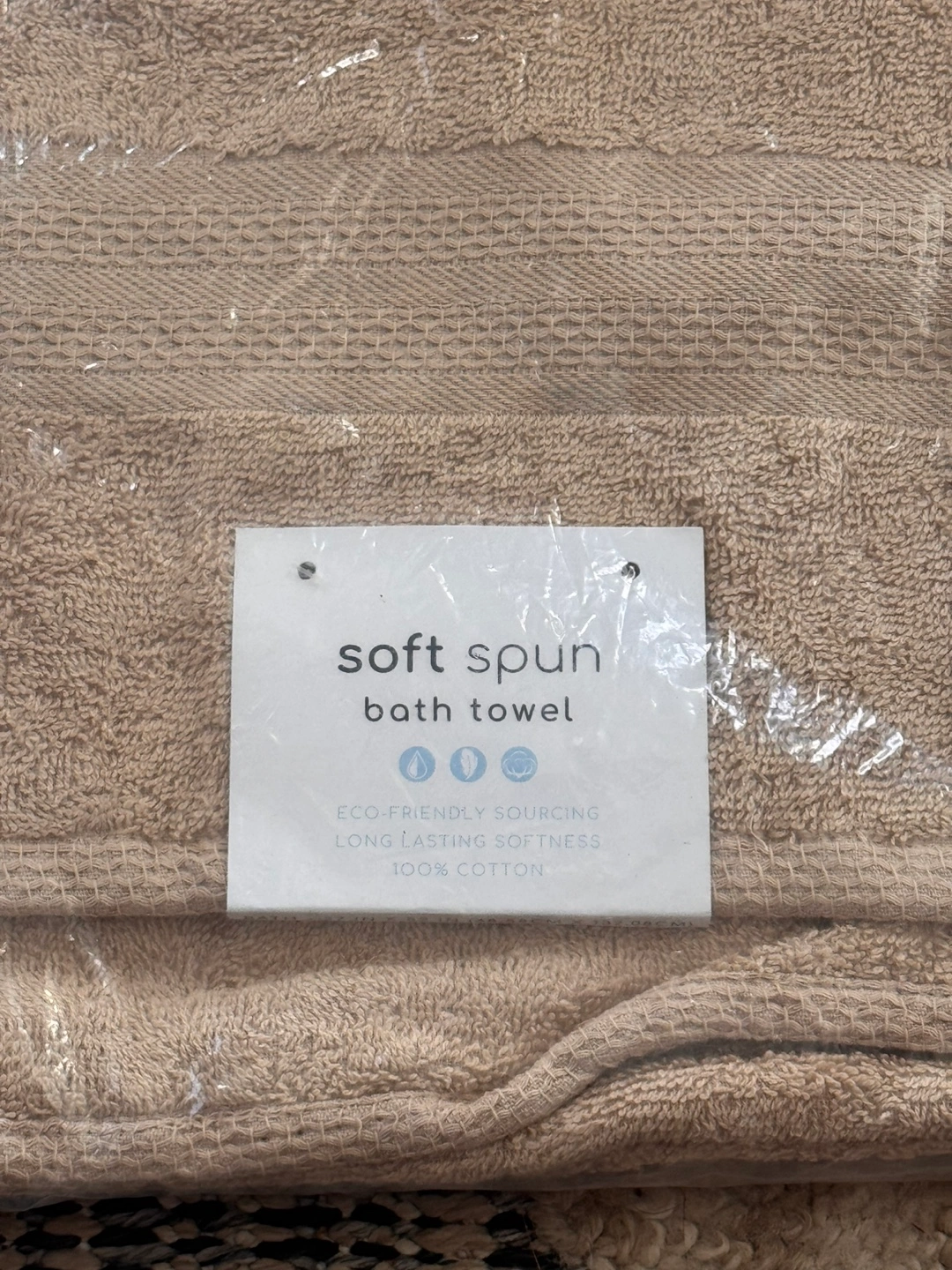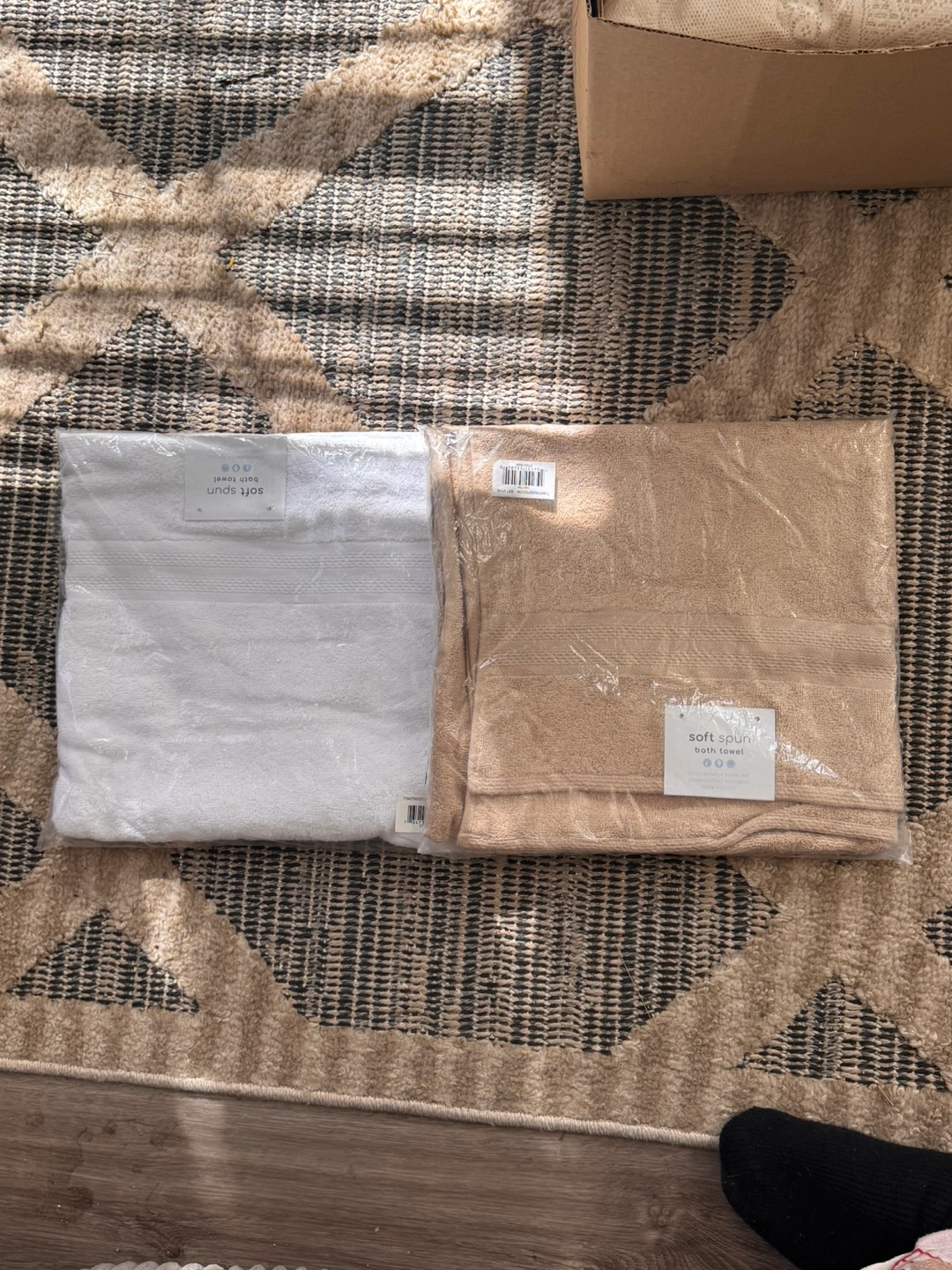 New bath towels, never used. One beige, one white. 100% cotton. Eco-friendly sourcing. Long-lasting softness.