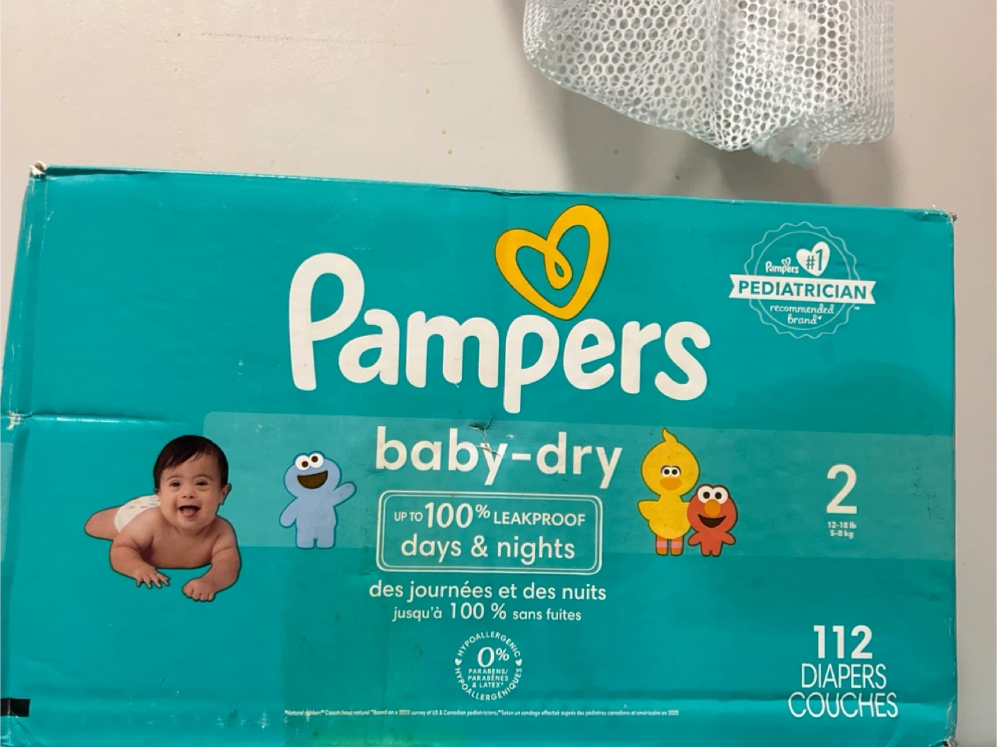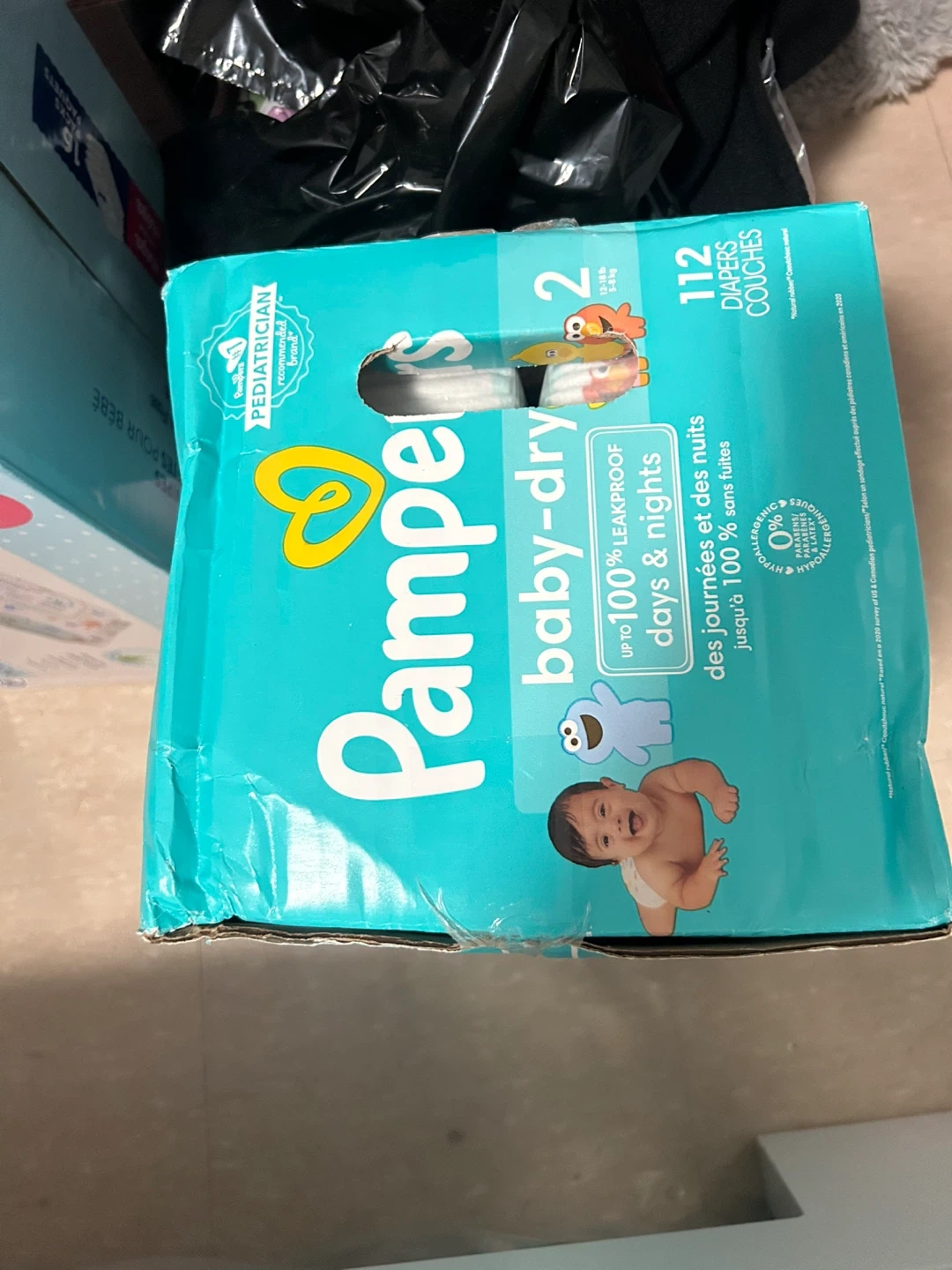 Pampers Baby-Dry diapers in size 2. This box contains 112 diapers. They offer up to 100% leakproof protection for days and nights. Hypoallergenic and made without parabens or latex.
