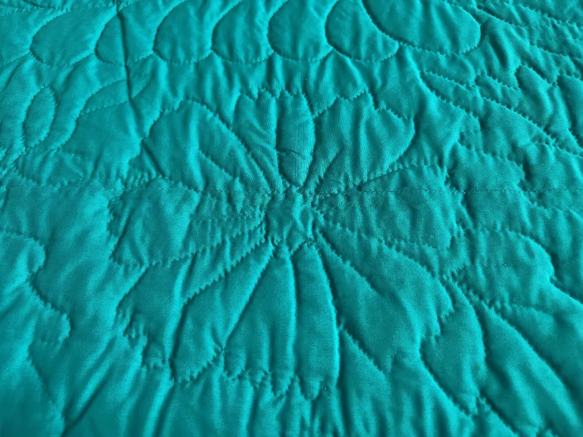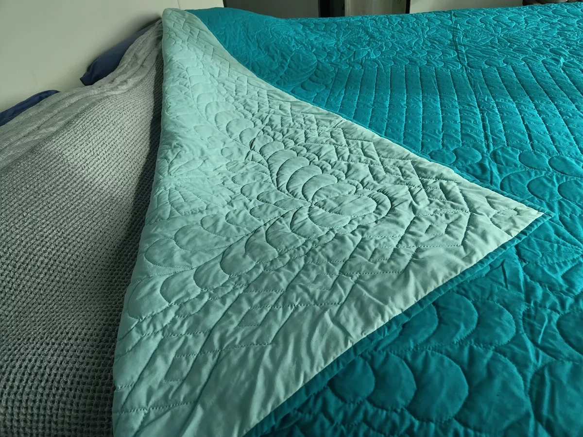 Primary Side: A rich azure blue, with intricate rocking-stitch quilting forming elegant patterns inspired by the dresden plate motif. This texture adds a visual and tactile depth that elevates the quilt to a true work of art.