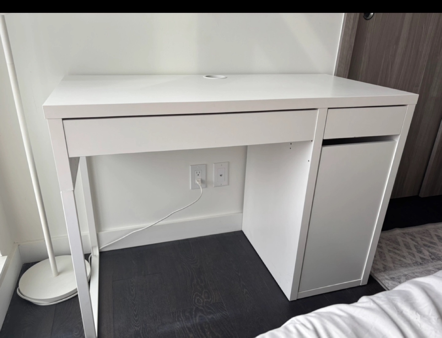 White desk. One drawer, one cabinet. Simple design. Good for small spaces. Assembly required.