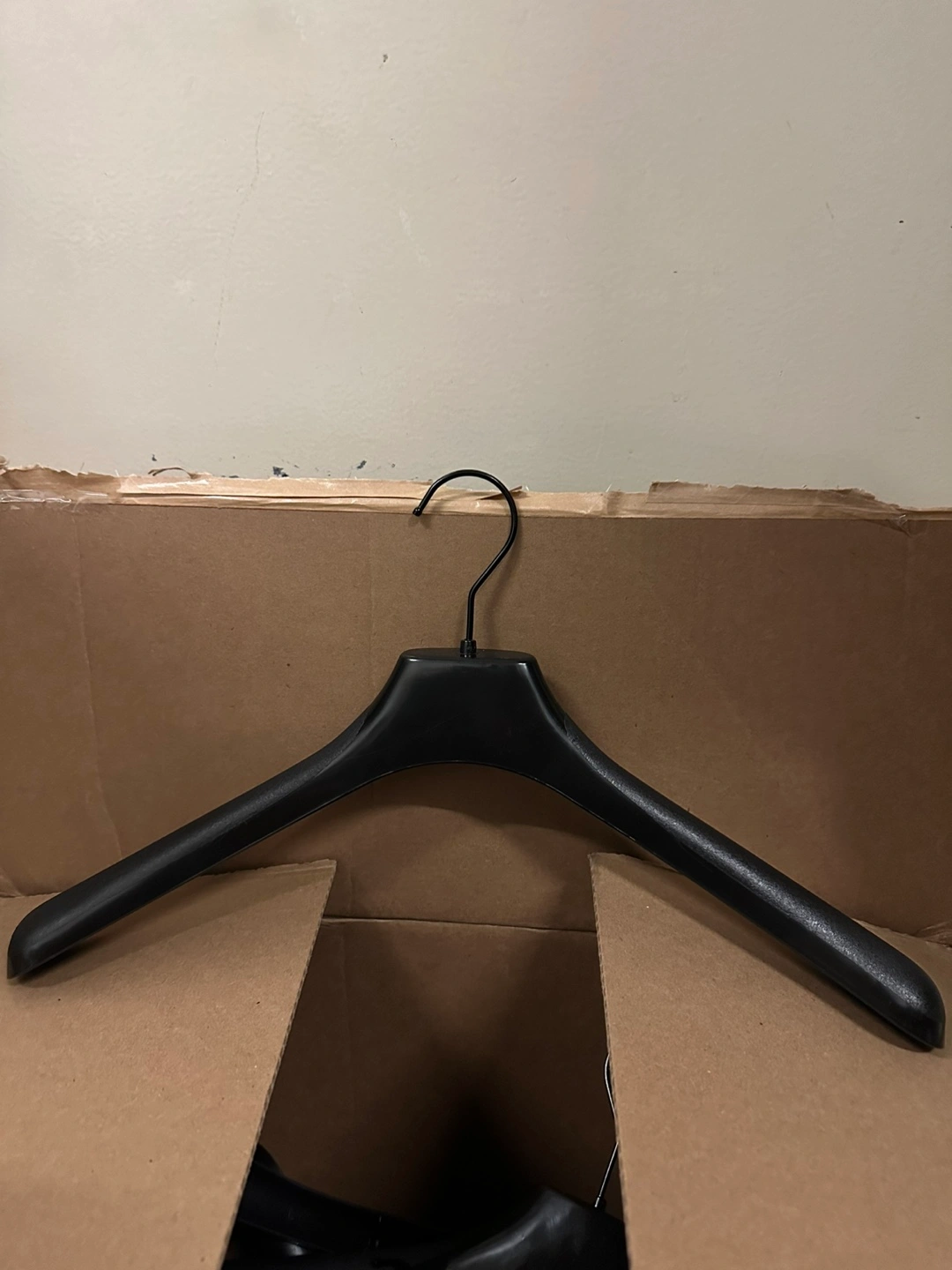 A box of black plastic clothes hangers. Great for organizing closets or for resale. Almost NEW condition.
