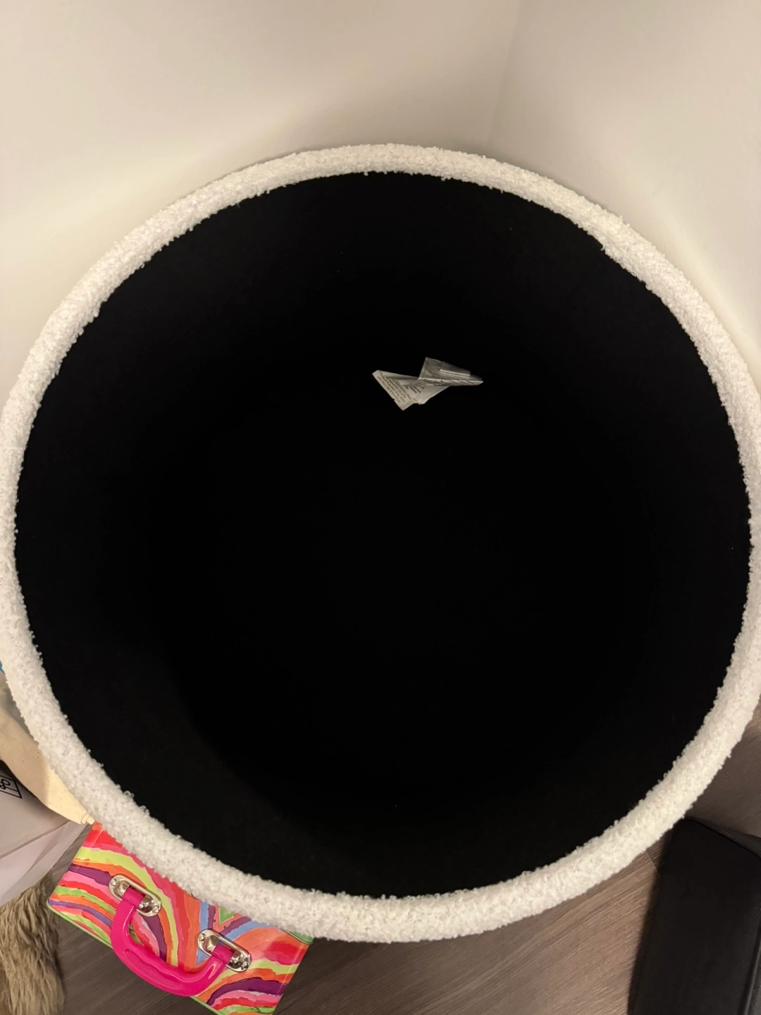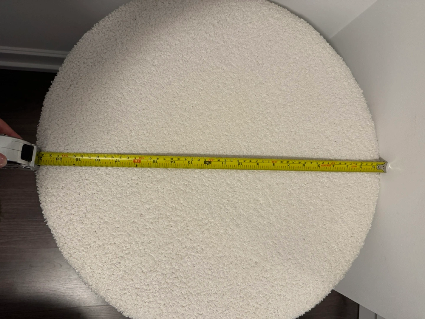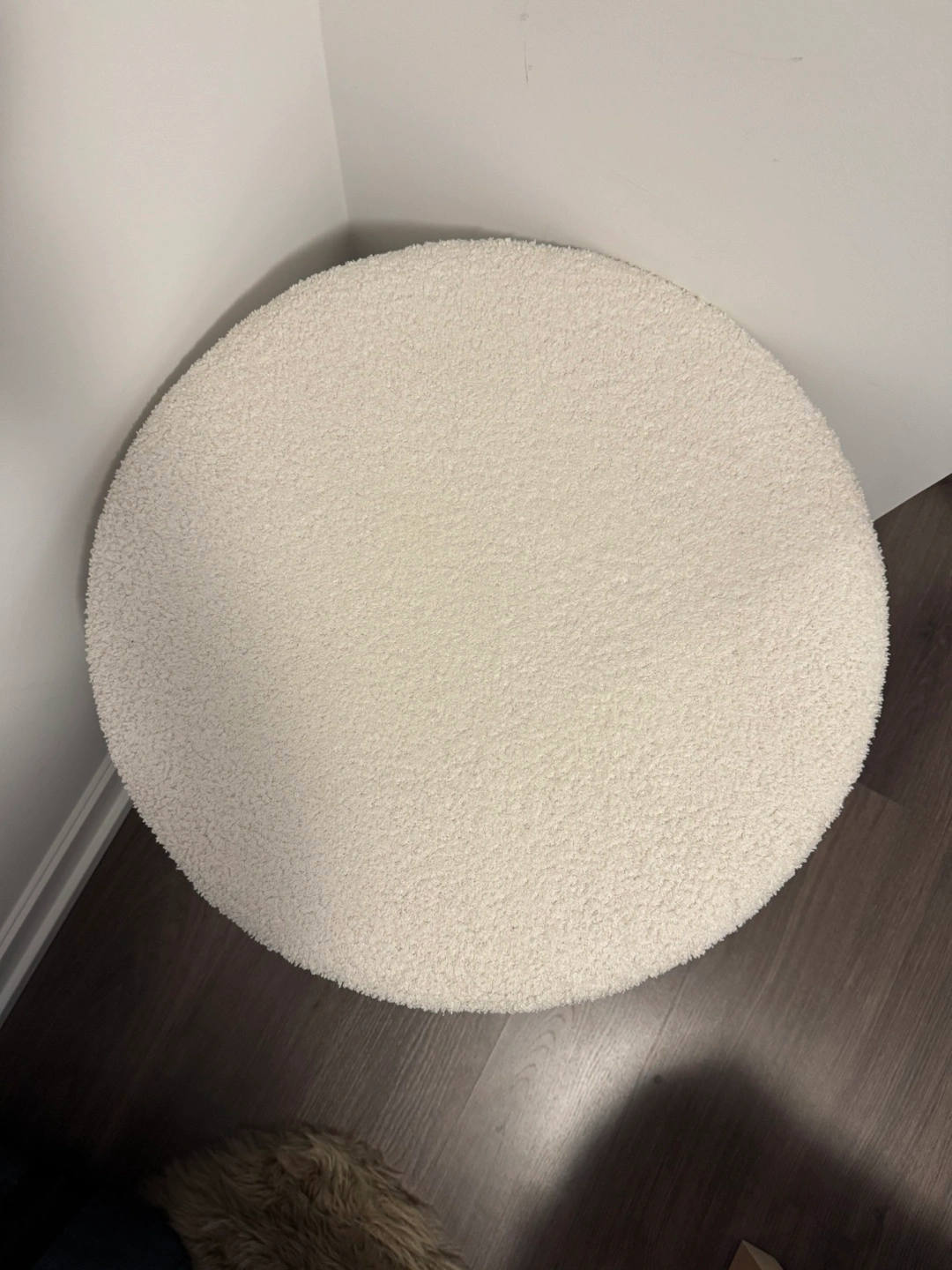 Fluffy white round ottoman.