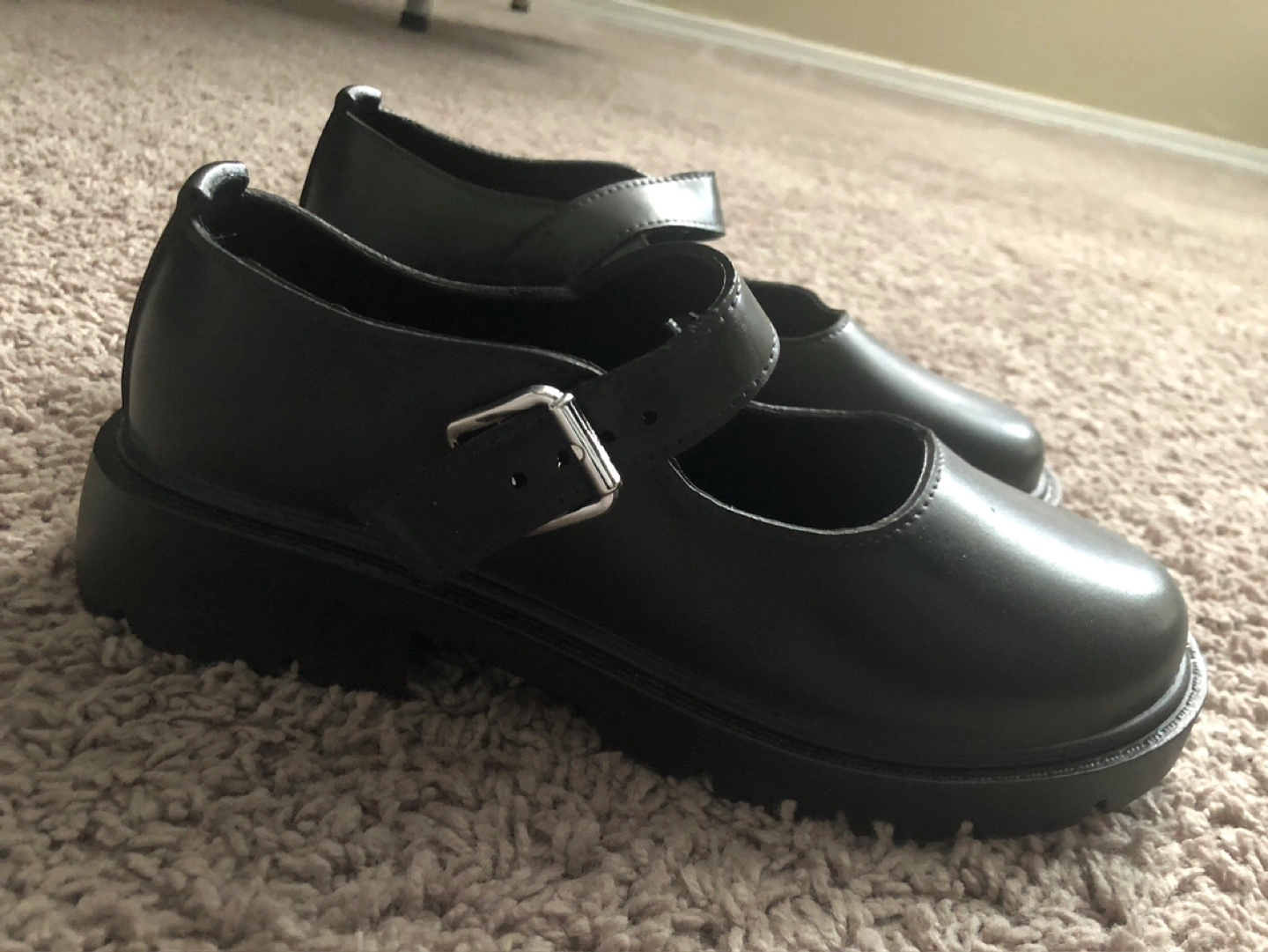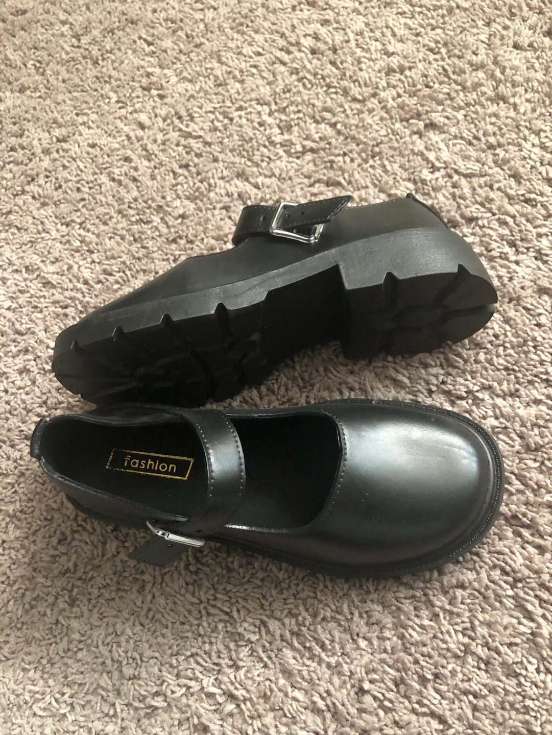 Pair of black leather-look Mary Jane shoes. Features a chunky sole and buckle strap. Good condition.