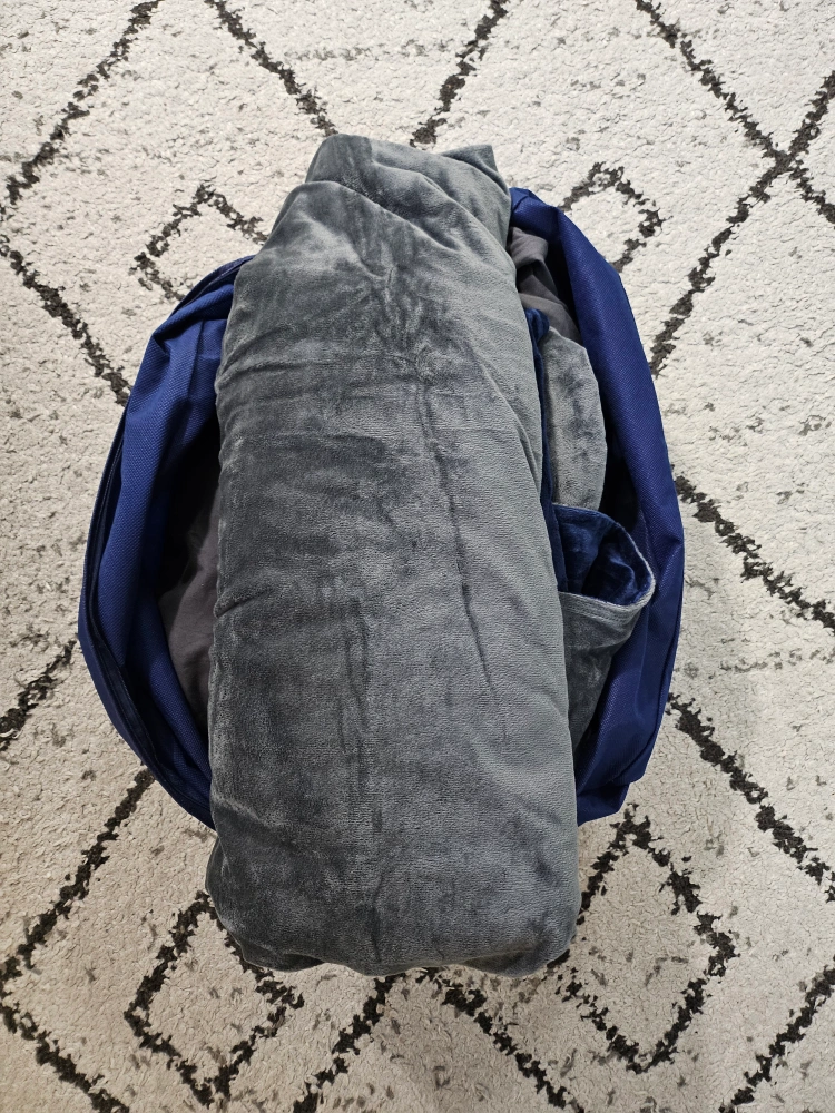Weighted blanket (15 lbs), reversible for year-round use. Cooling Tencel side and warm fleece side. Includes a convenient carrying bag. Perfect for all seasons.