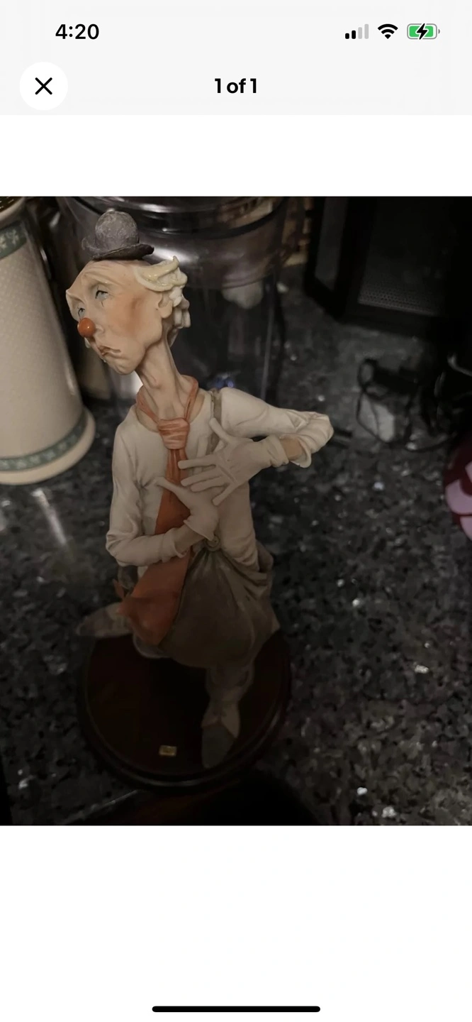 Collectible figurine. Features a sad clown in a bowler hat. Detailed sculpting. Rests on a dark circular base.i have no box for the figurine