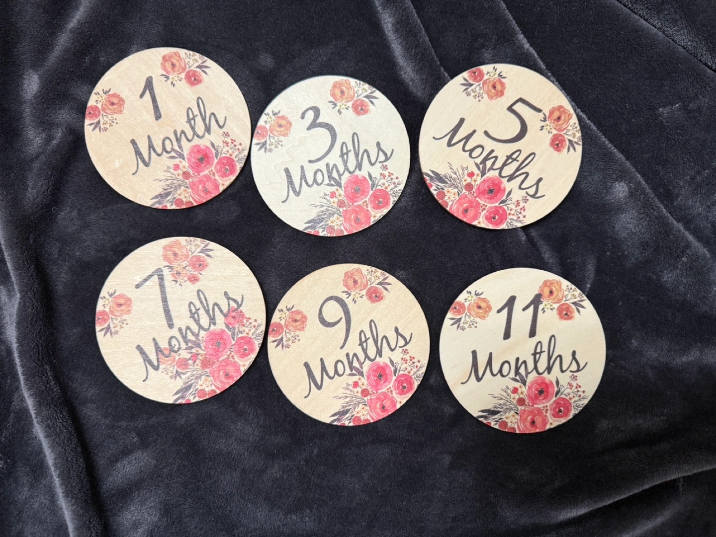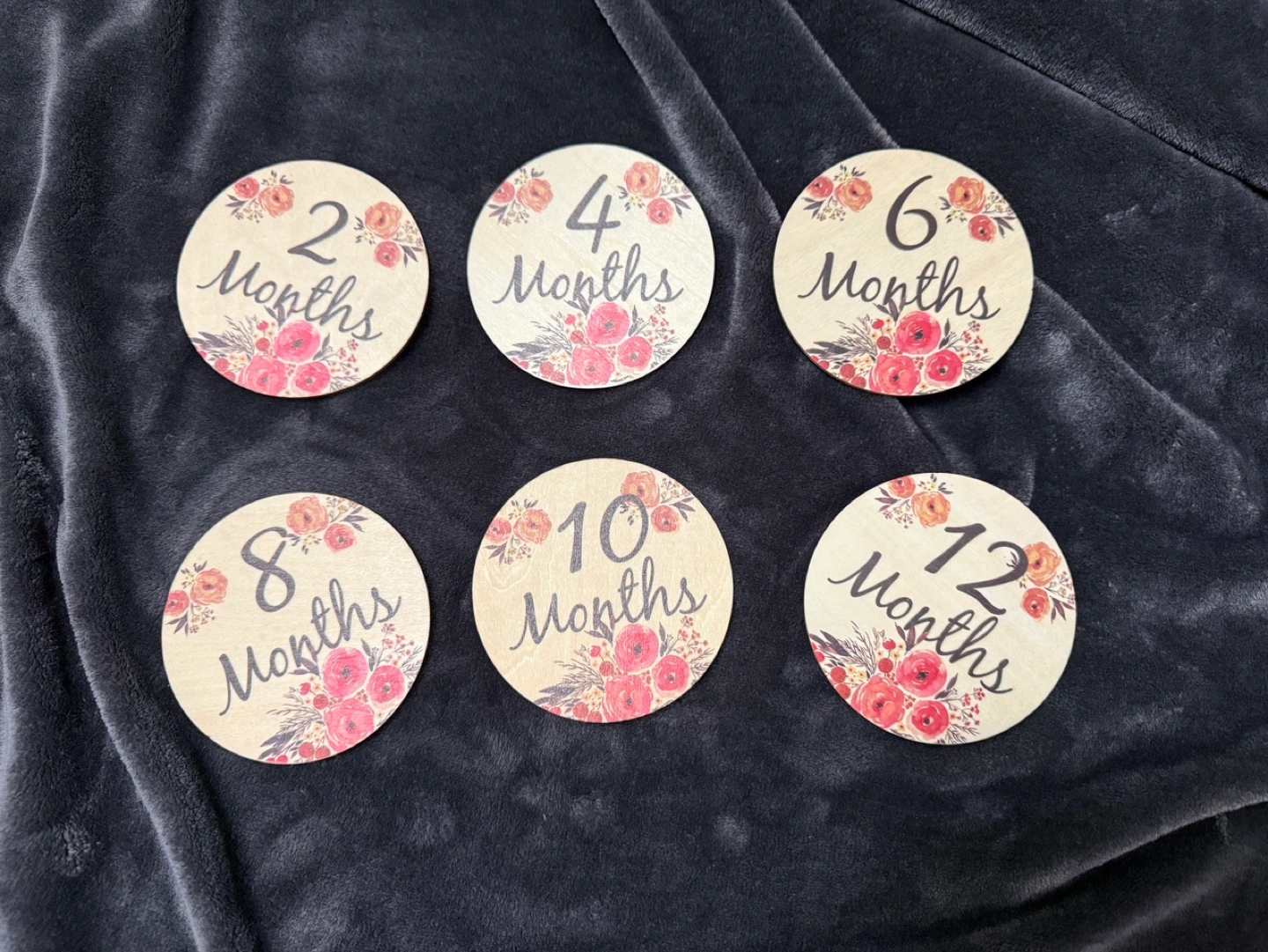Twelve wooden milestone markers. Floral design. Months 1-12. Perfect for monthly baby photos.