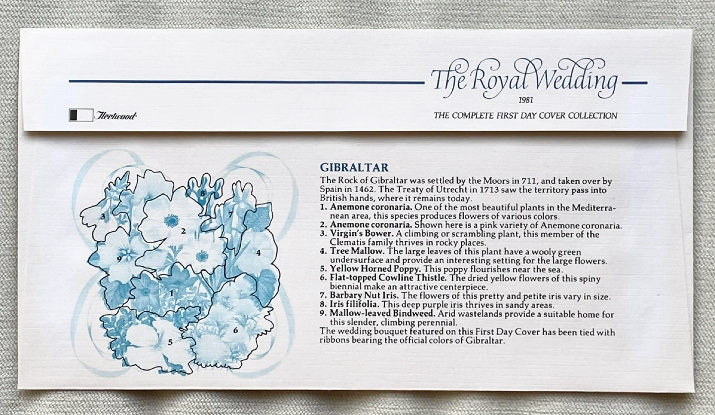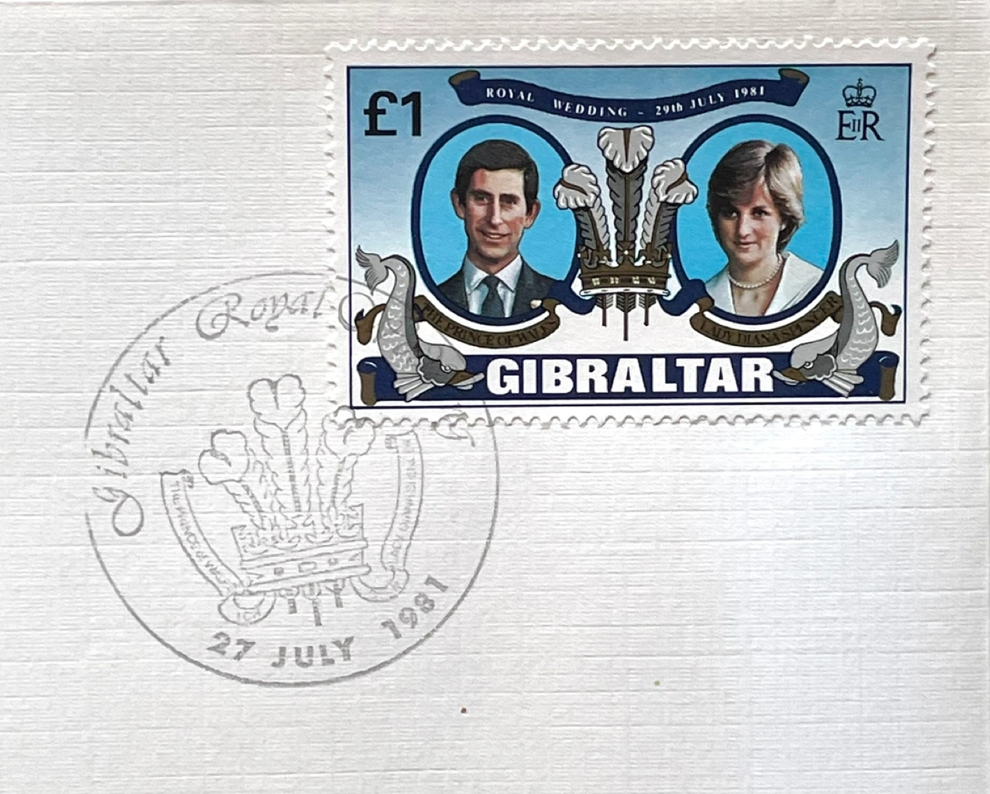 A first day cover issued by Gibraltar for the 1981 Royal Wedding of Princess Diana and Prince Charles.
