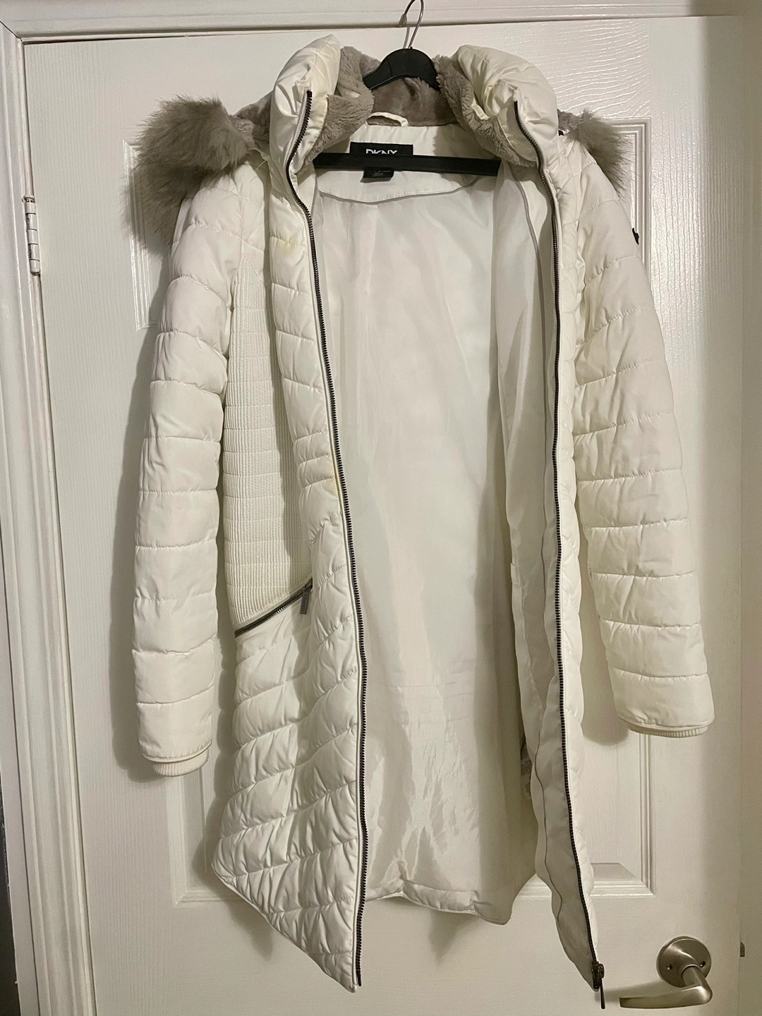 Women's DKNY white puffer jacket. Size small. Features a faux fur trimmed hood and a quilted design.