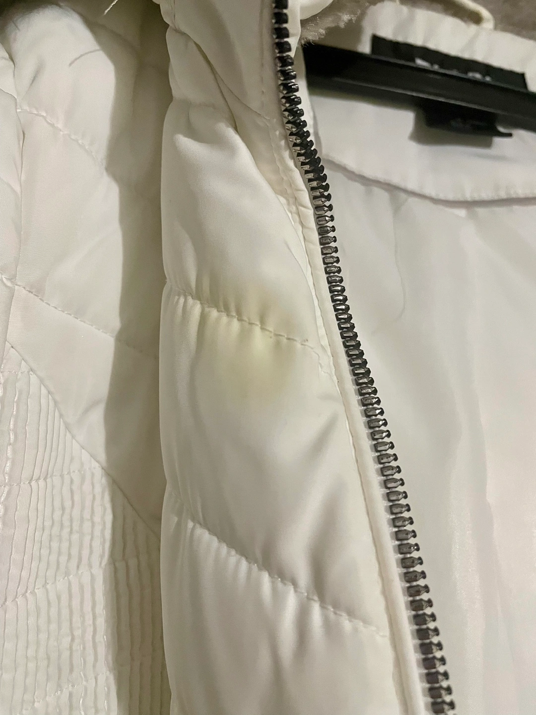 It’s a very warm jacket with soft hood, long sleeves and front zipper closure. There is some minor staining but it has only been dry cleaned.