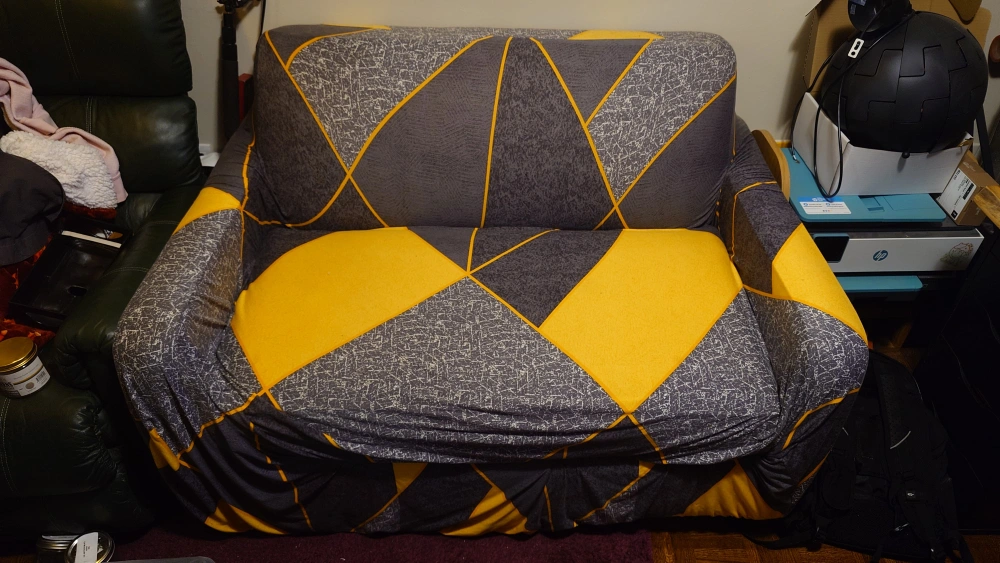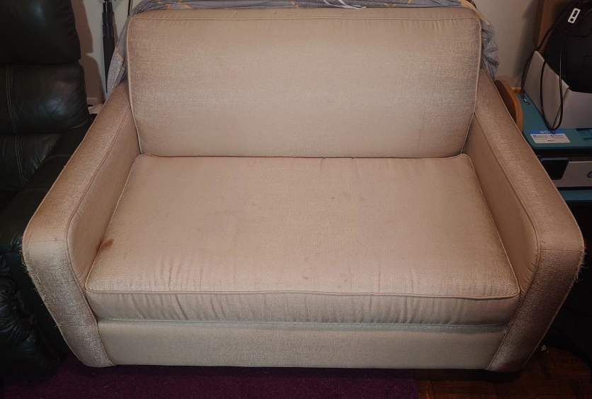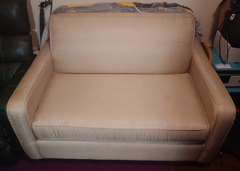 free!!! COME GET IT PLS!!!! this was my husband's grandmother's before she had to downsize. it is beigeish/cream with a stain on the cushion but you can flip it. it has a cover on it, you can have it too. slight cat damage on one of the arms under the cover. there's a folding bed inside that's never been used. we just don't need it for this small room anymore even though I rly like it. pick up only pls!!!