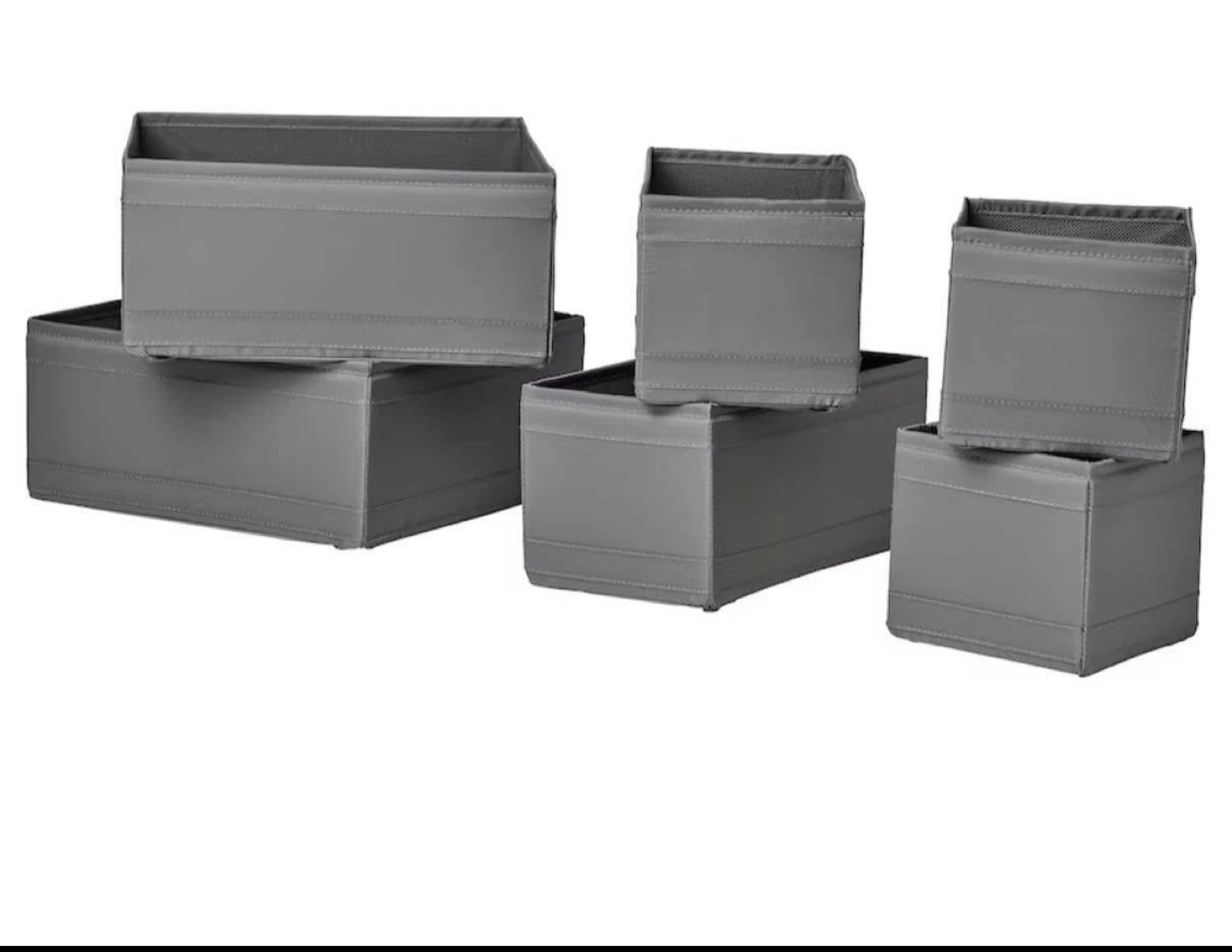Set of six grey fabric storage boxes. Various sizes, ideal for organizing drawers or shelves. Perfect for closets or any storage solution.