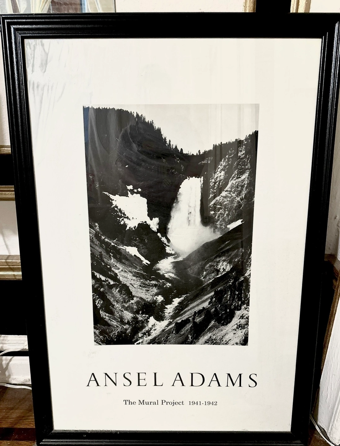 Three framed black and white prints from Ansel Adams' The Mural Project (1941-1942). Leaves, Glacier National Park; Yellowstone Falls. Simple black frames. Ready to hang.