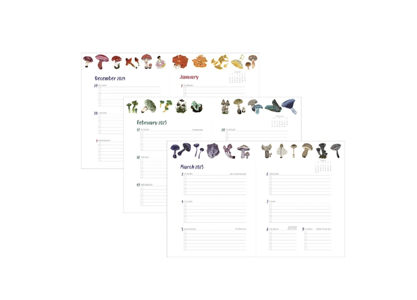 Mushrooms are a contemporary obsession, from amateurs foraging wild mushrooms to stylists decorating with the whimsical shapes of fantastical fungi, and even mushroom-themed clothing. Fungi fascination is here to stay! Kelsey Oseid’s remarkable illustrated fungi are at once informative and enchanting. Known for her rich gouache paintings of natural history and astronomy subjects, Kelsey is the Minneapolis-based artist behind the best-selling book, What We See in the Stars. For this lavishly illustrated weekly softcover planner, Kelsey showcases the diversity of mushrooms across the rainbow.
