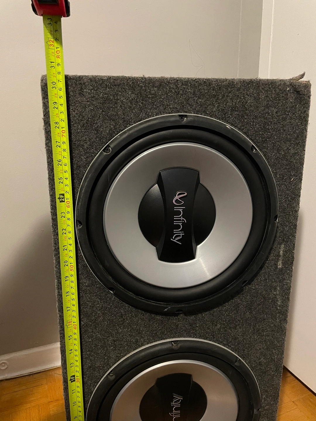 Used dual 12 inch Infinity subwoofer in custom enclosure. Features two speaker inputs and one power input. Minor wear and tear.
