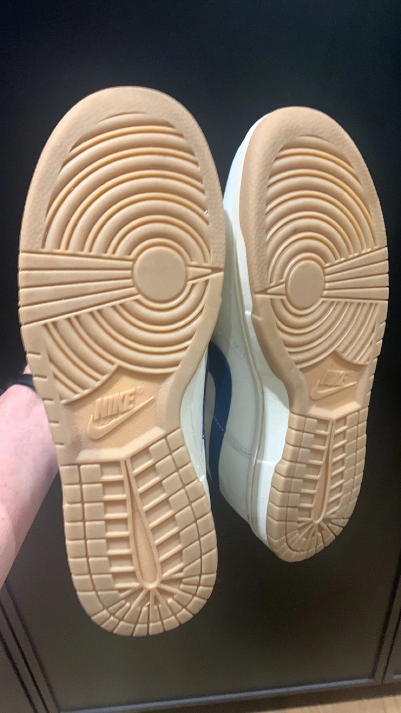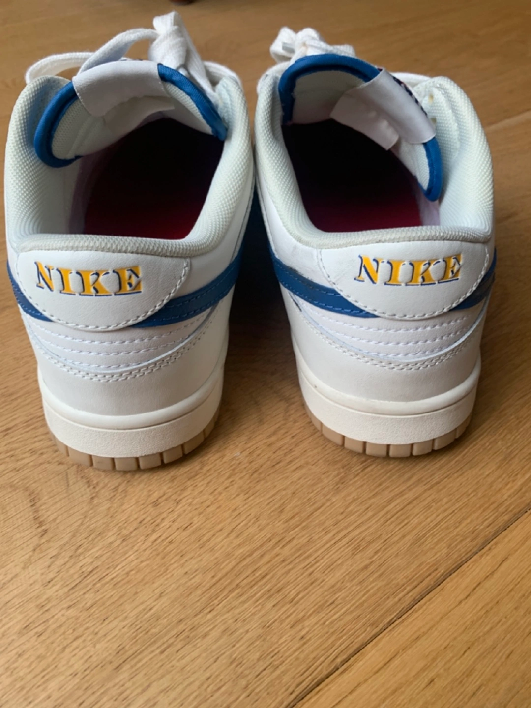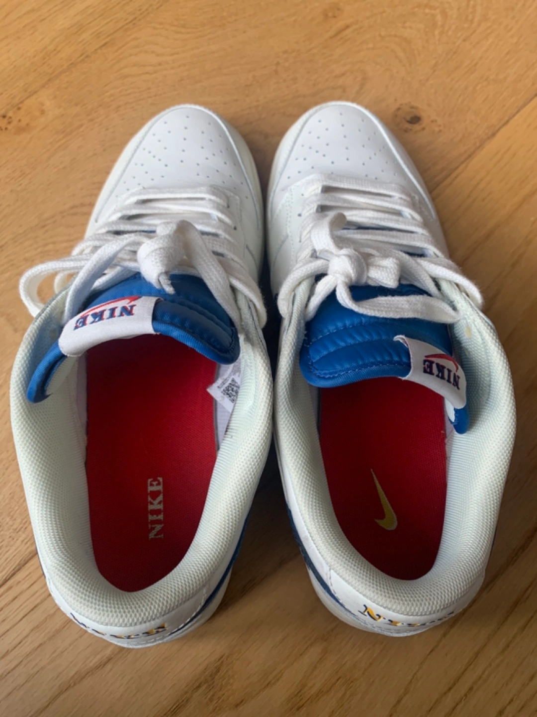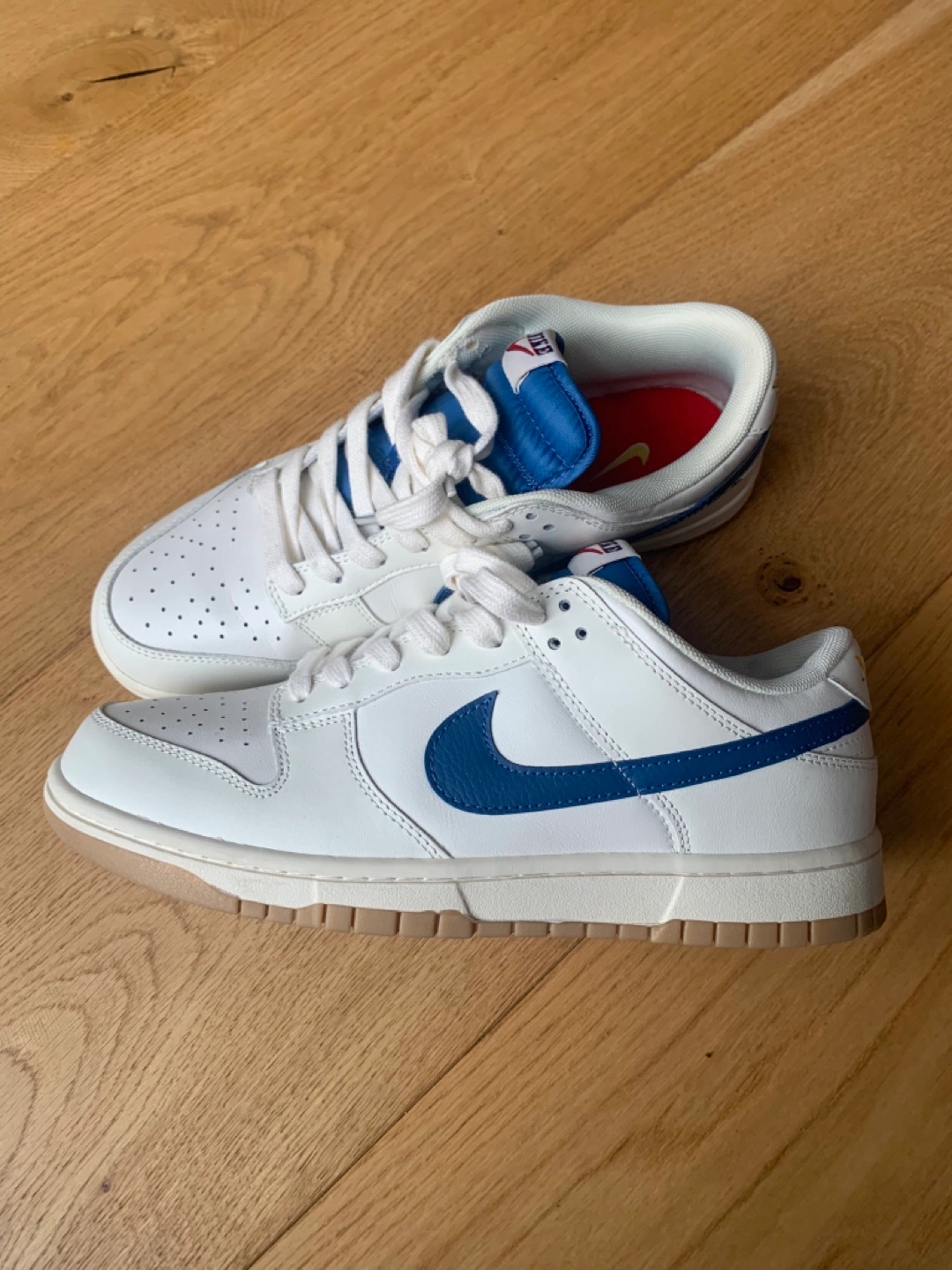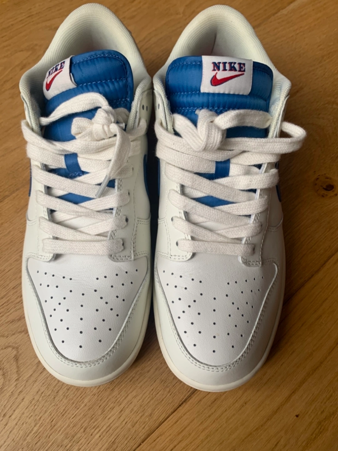 Low-top sneakers. White leather upper. Blue accents. Gum sole. Classic Nike design. Comfortable and stylish. RARE find! Smoke-free home on Balsam Avenue south of Queen st