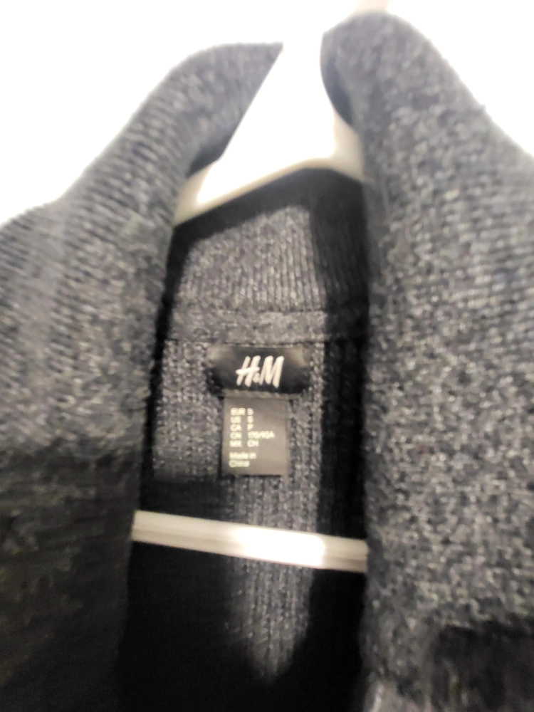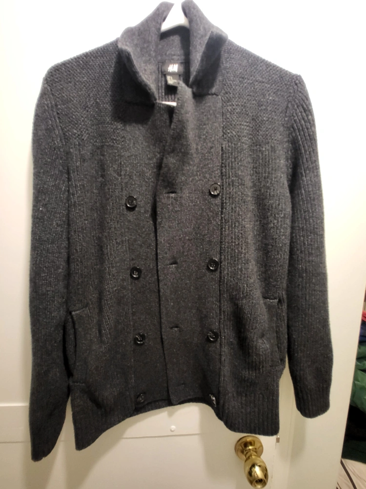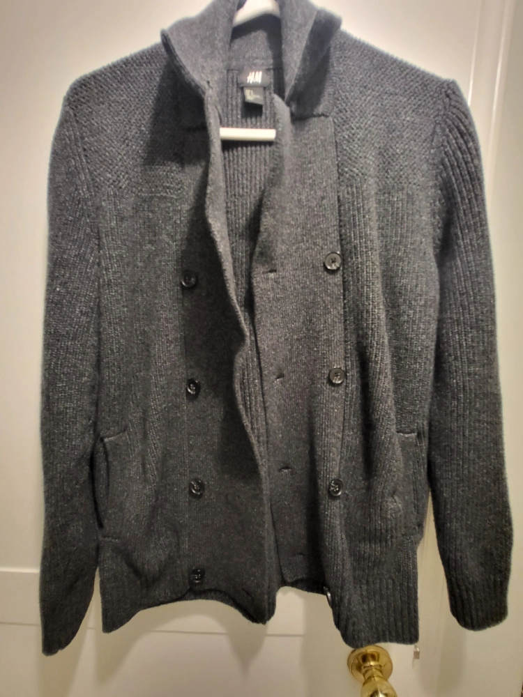 Dark grey men's cardigan. Double breasted, collared. Knit material. Two pockets. Size small.