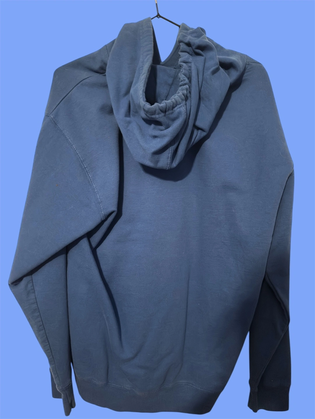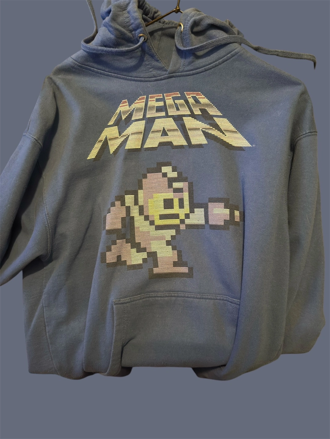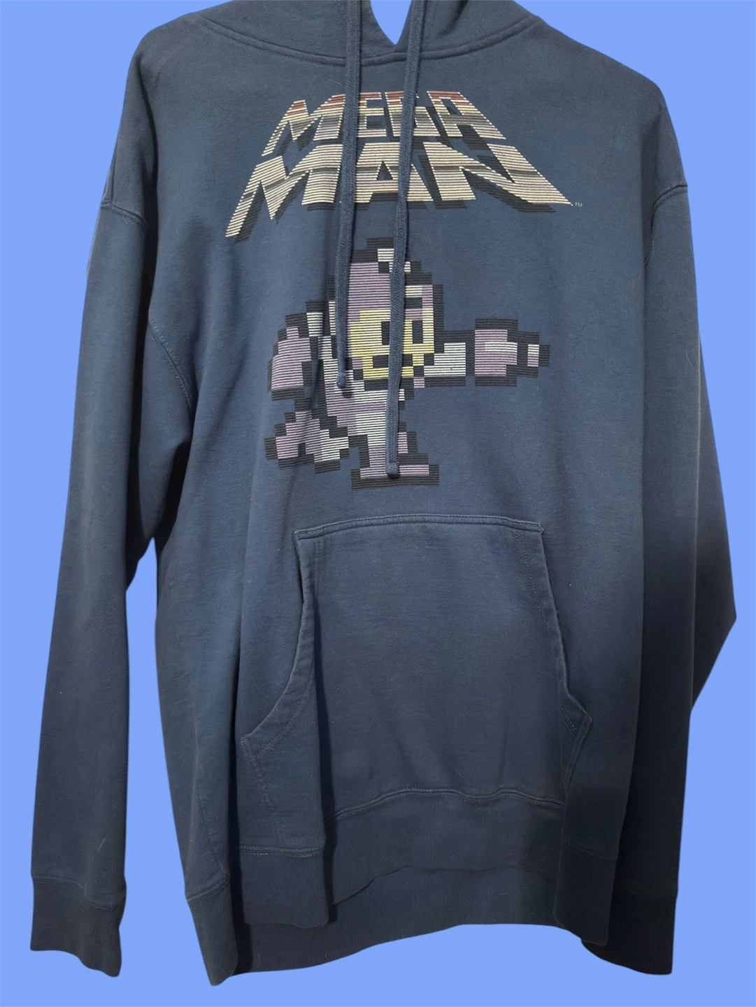Men's Mega Man hooded sweatshirt. Blue. 80% cotton 20% polyester. Midweight. Features a pixelated Mega Man graphic.