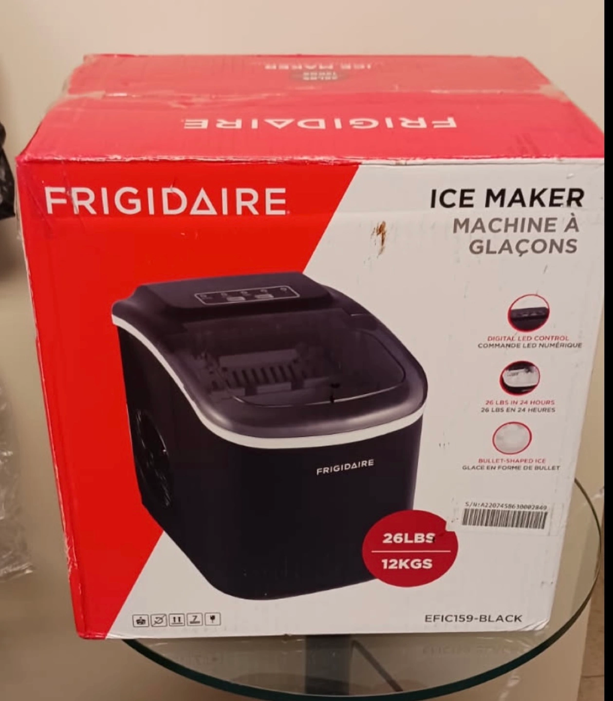 New Frigidaire ice maker. Makes bullet-shaped ice. Digital LED control. Produces 26 lbs in 24 hours.
