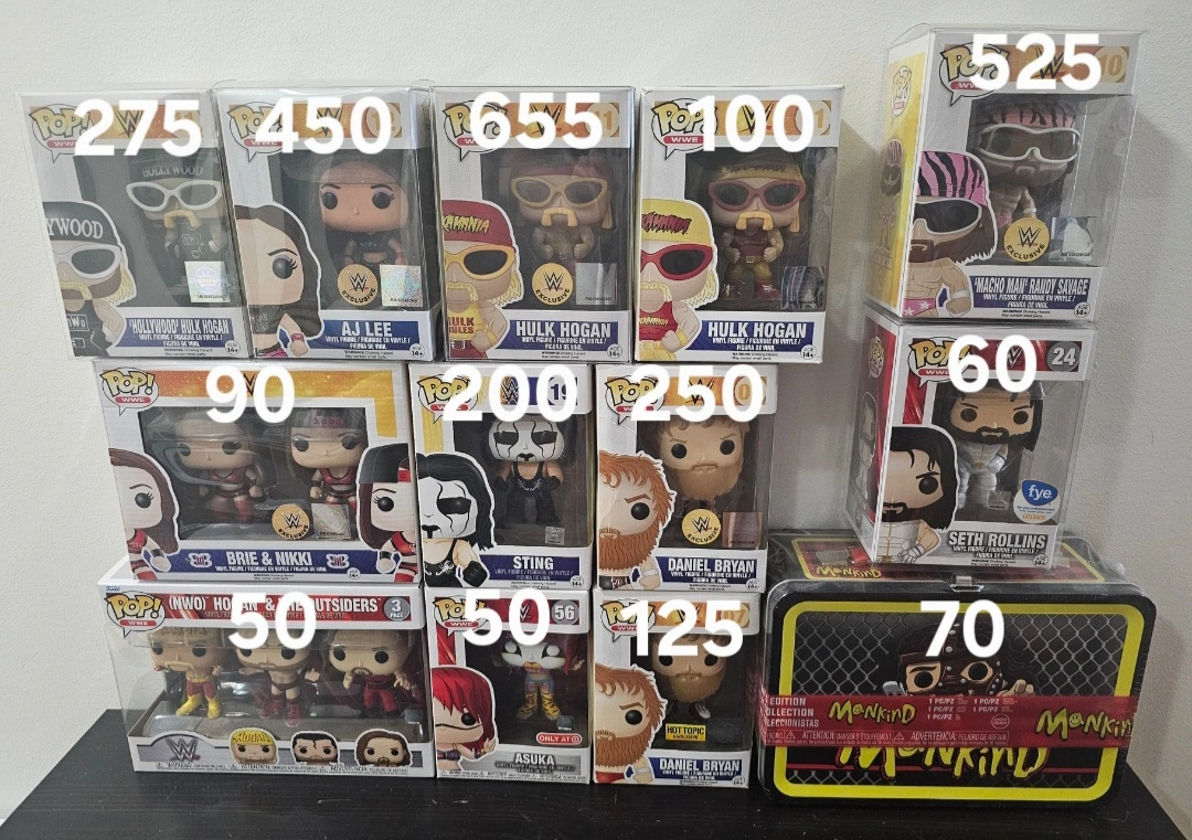 Collection of Funko Pop! vinyl figures featuring various WWE wrestlers. Includes Hulk Hogan, Macho Man Randy Savage, AJ Lee, Brie & Nikki Bella, Sting, Seth Rollins, and more. Also, a Mankind collectible tin. Prices vary per figure.