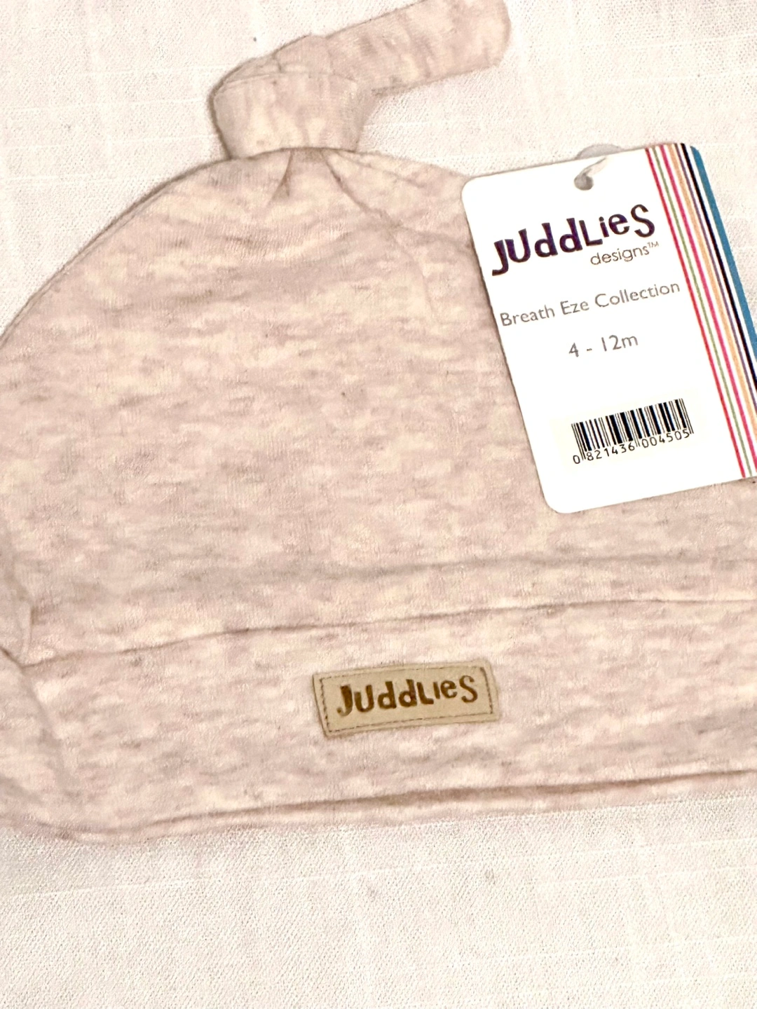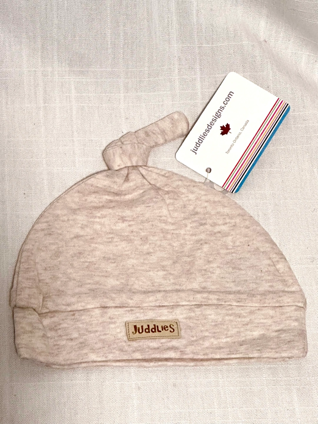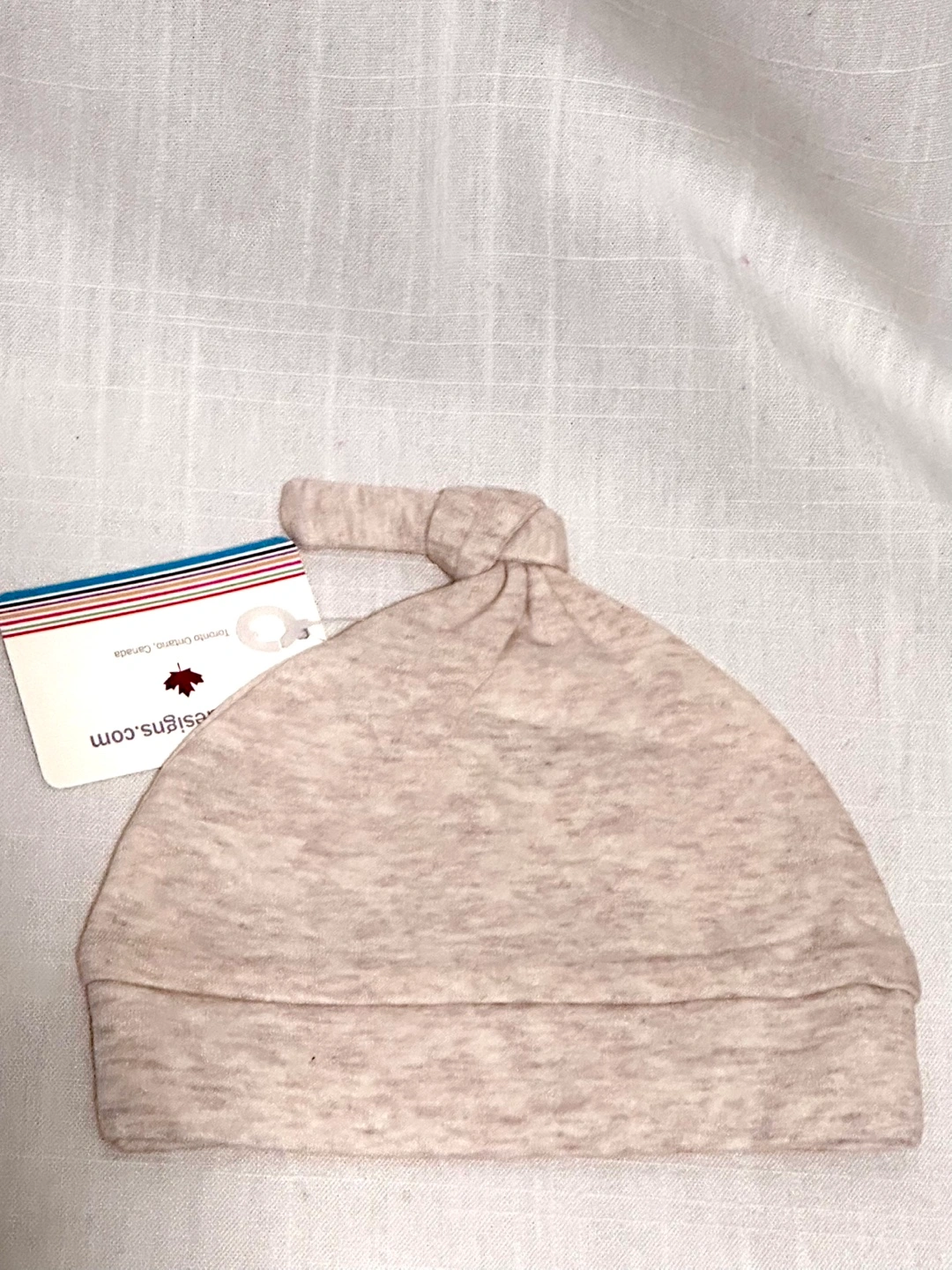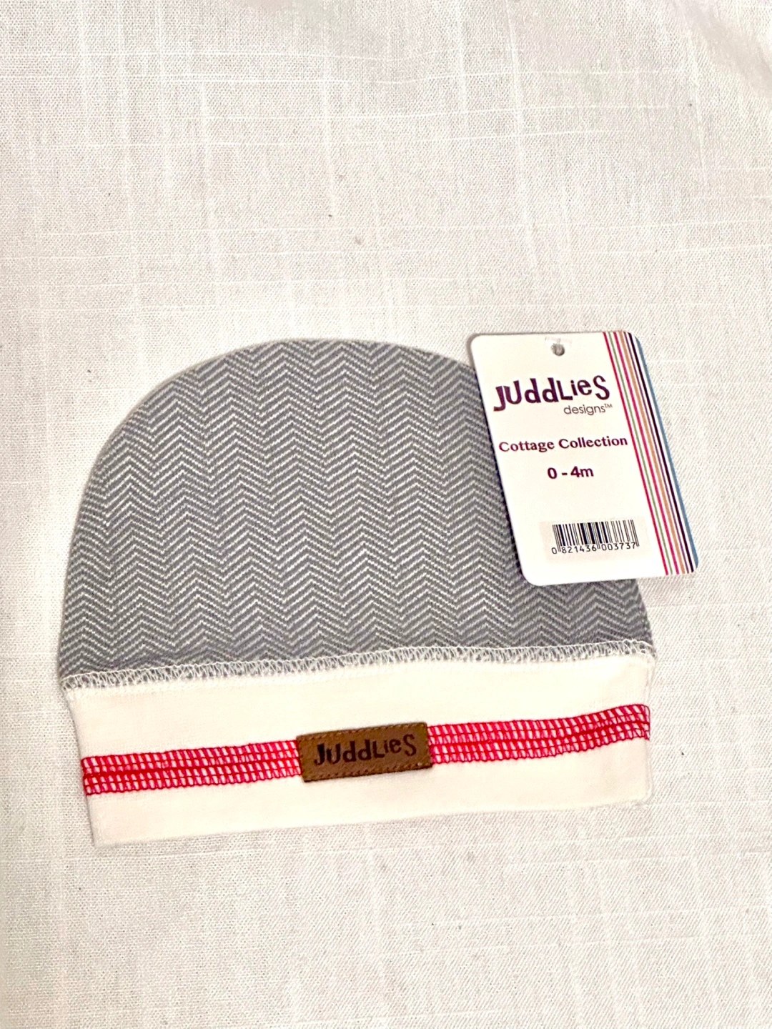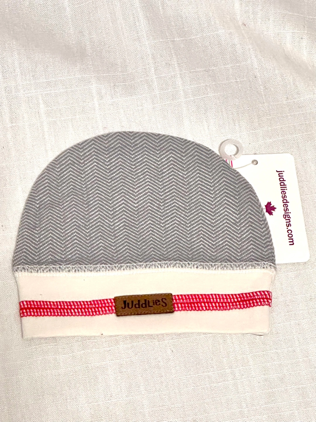 New with tags. Two baby hats, one beige and one grey with a herringbone pattern and red trim. Sizes 0-4 and 4-12 months. Soft premium cotton material. Perfect for newborns and babies!