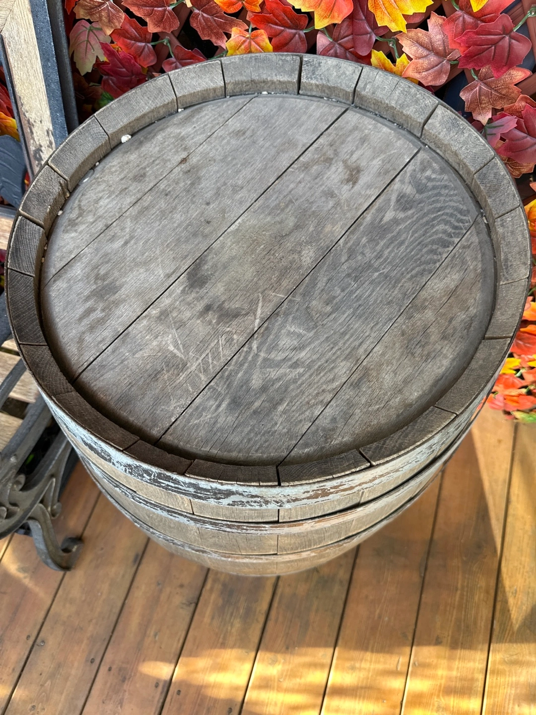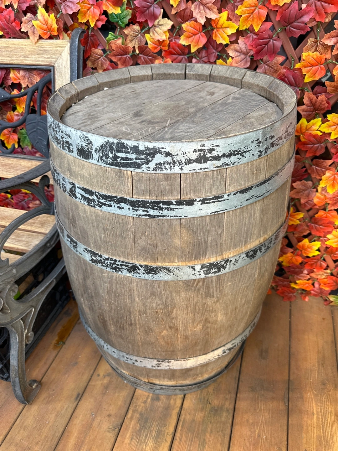 Small rustic wooden barrel. Great for decor or storage. Shows wear consistent with age and use. Metal bands around the barrel.