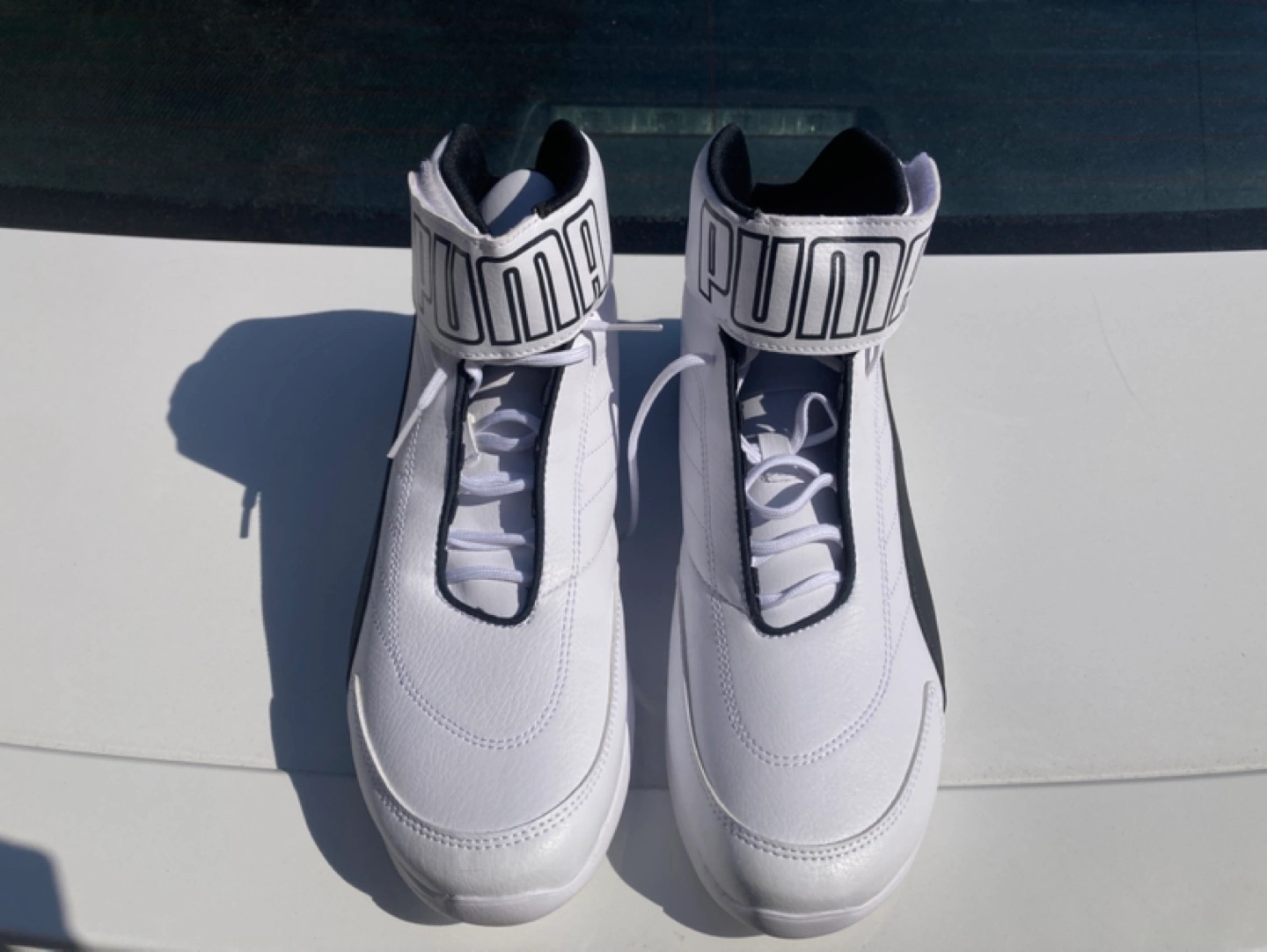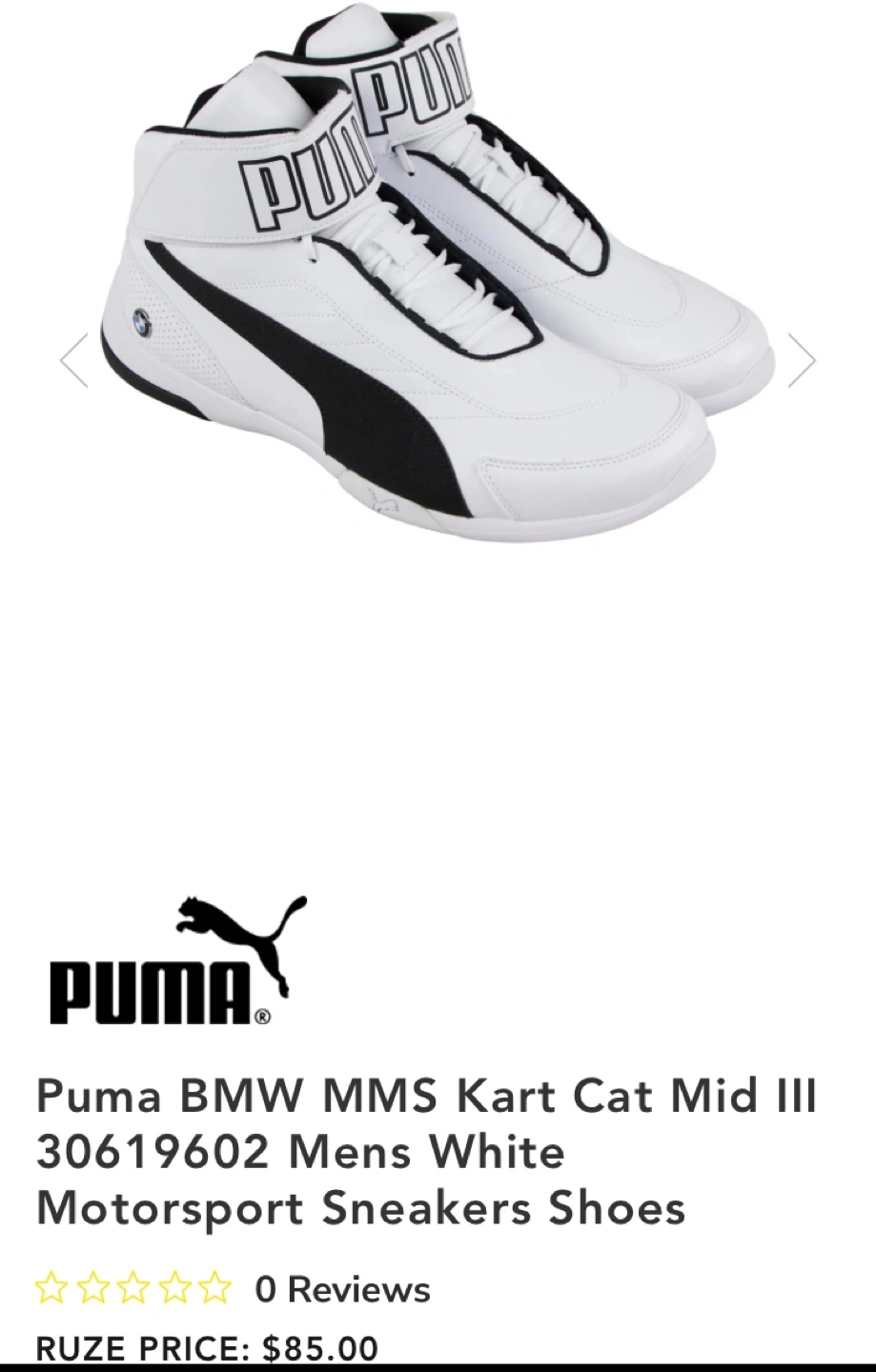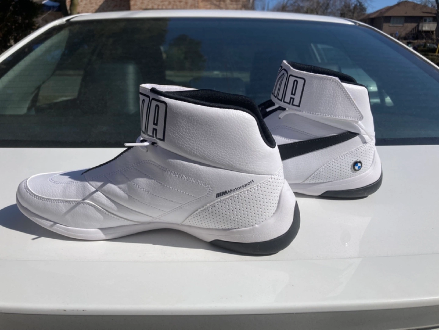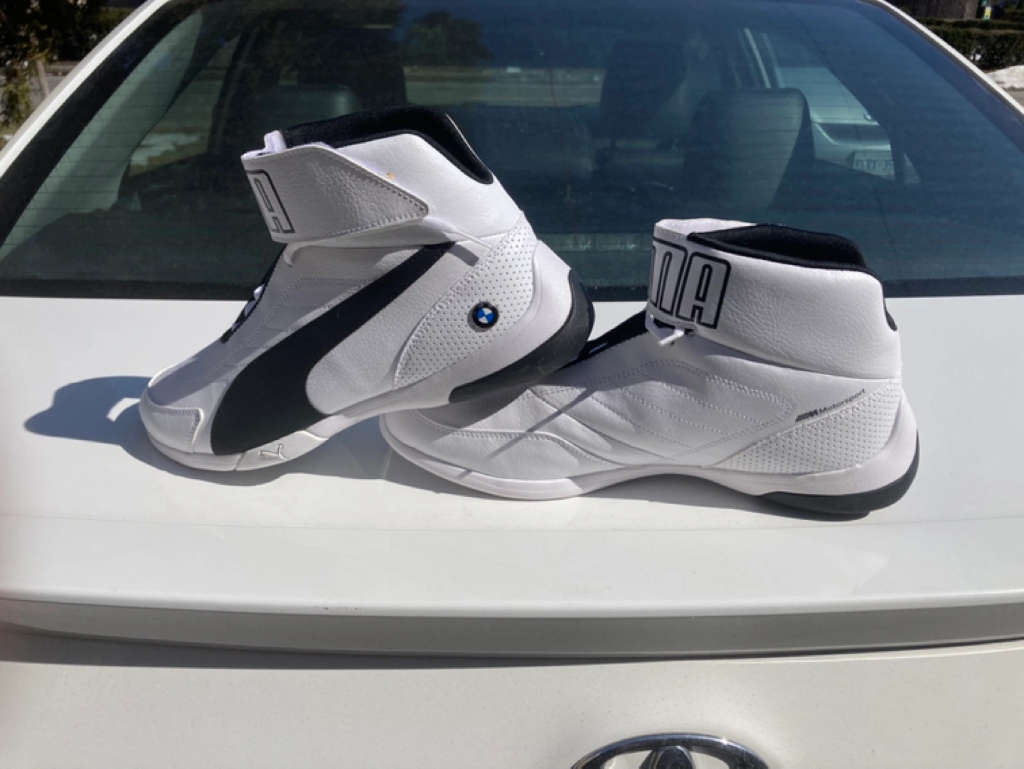 Never worn. Men's white and black Puma BMW Motorsport sneakers. Mid-top style with velcro strap. Excellent condition.