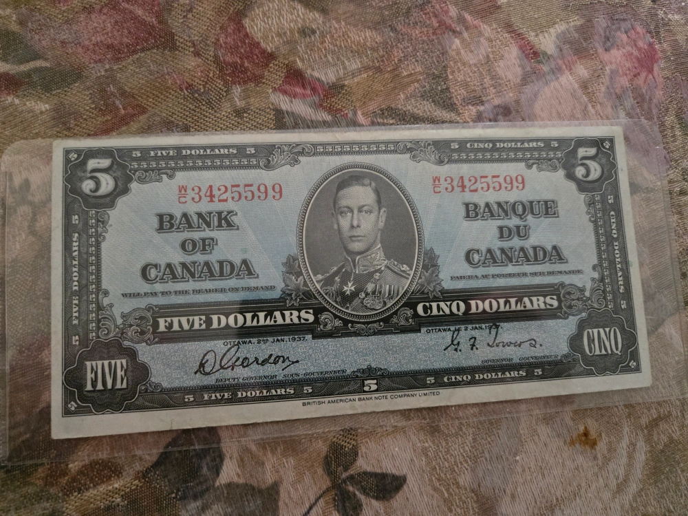 Vintage Bank of Canada Five Dollar Bill 1937