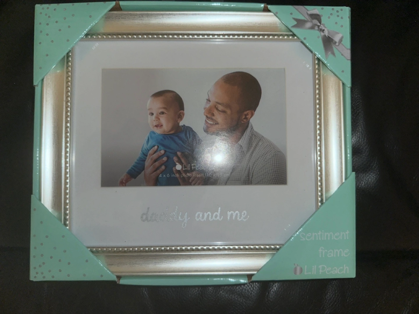 Silver framed photo frame. Features a 4x6 inch photo insert. Mint green packaging. Says "Daddy and Me".