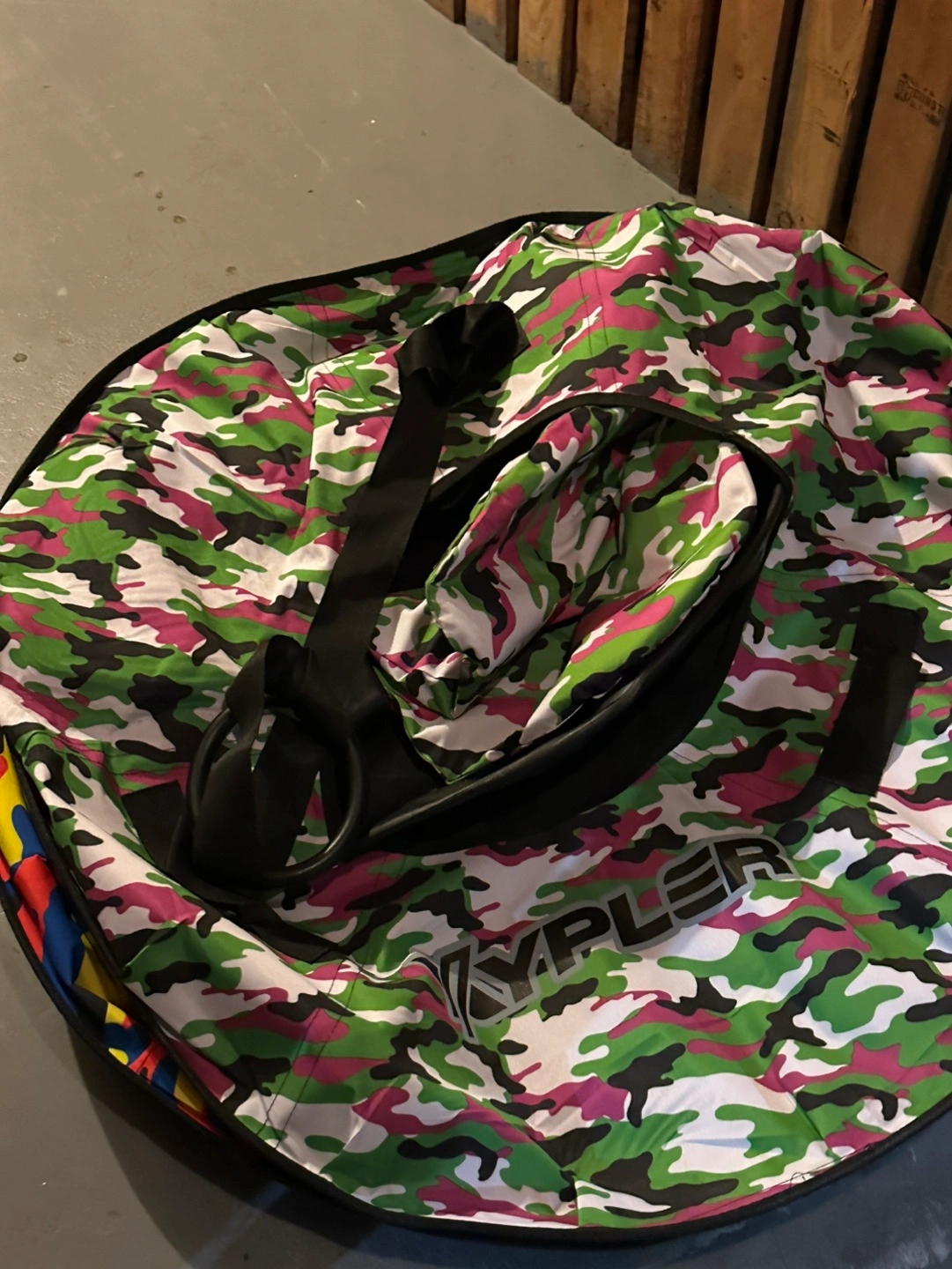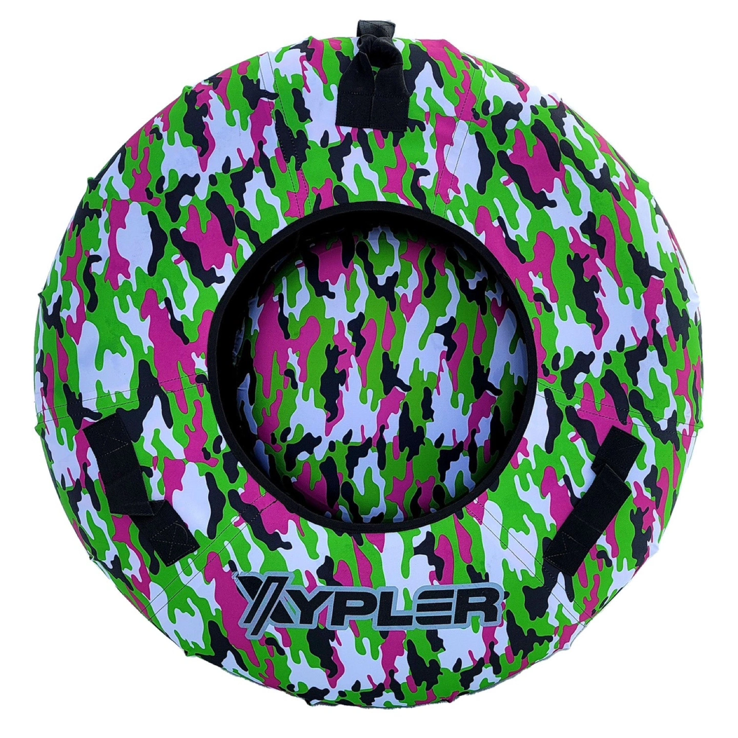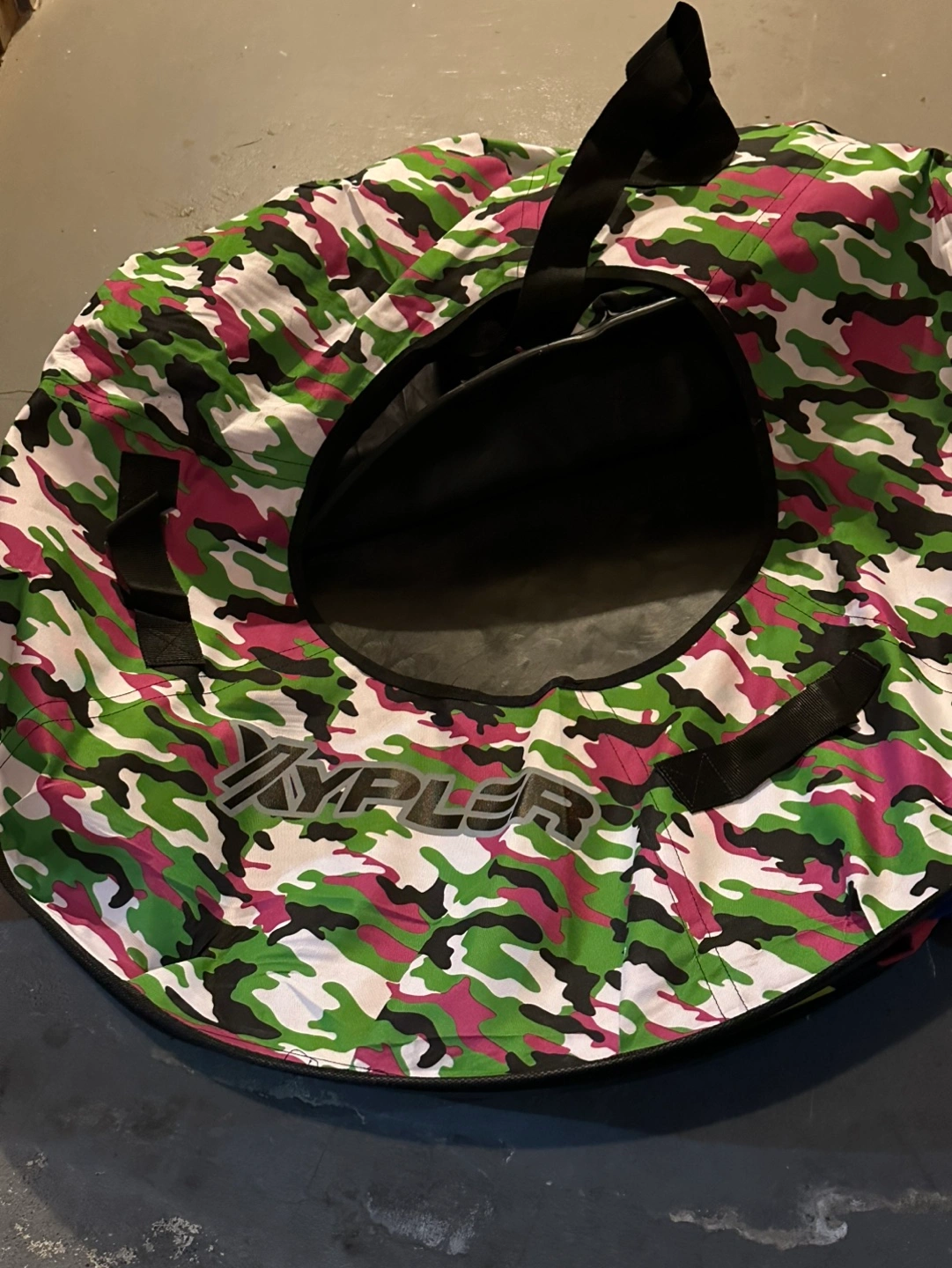 Fun multi-use tube. Pink, green and black camo pattern. Includes carrying handle. Great for winter and summer fun!