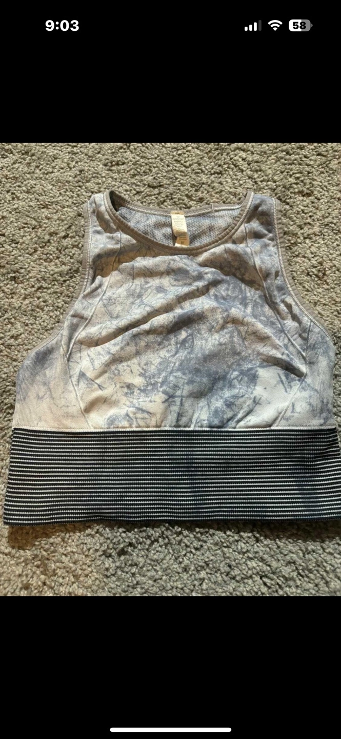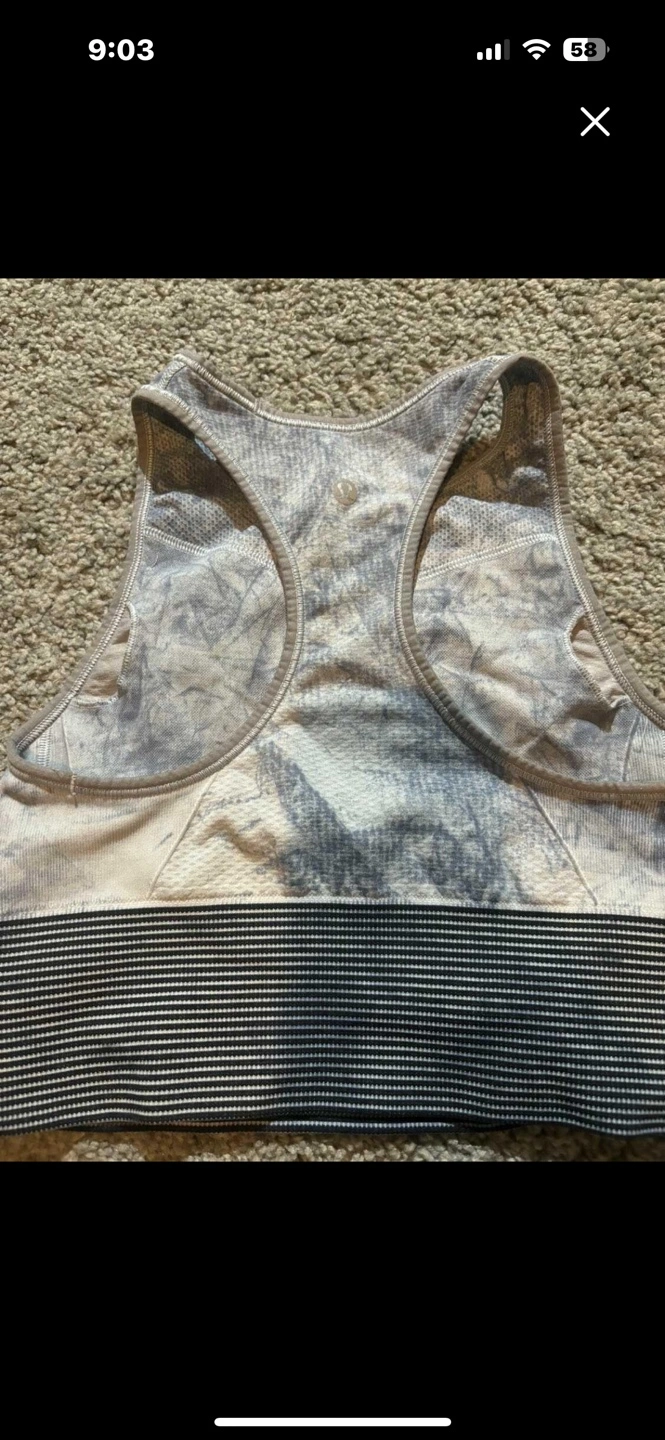 Lululemon Ebb to Train bra. Size 4. Grey and blue tie-dye pattern. Excellent condition. Will deliver to Airdrie