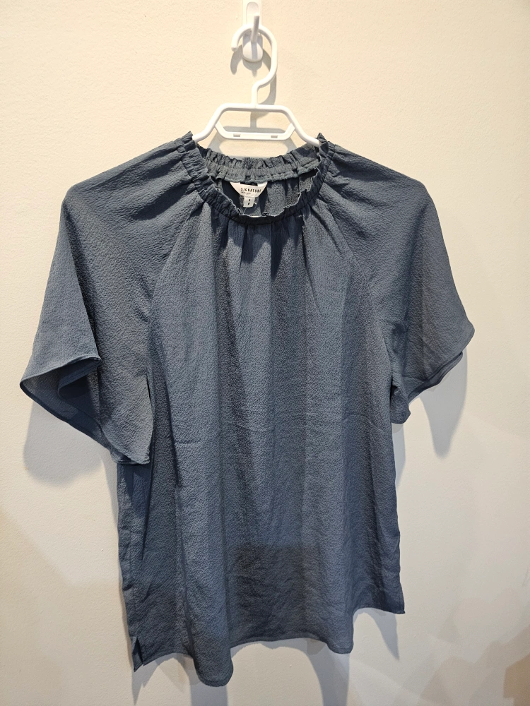 Blue, short-sleeved blouse. Small size. Textured fabric. Round neckline with smocking detail. Slightly flared sleeves.