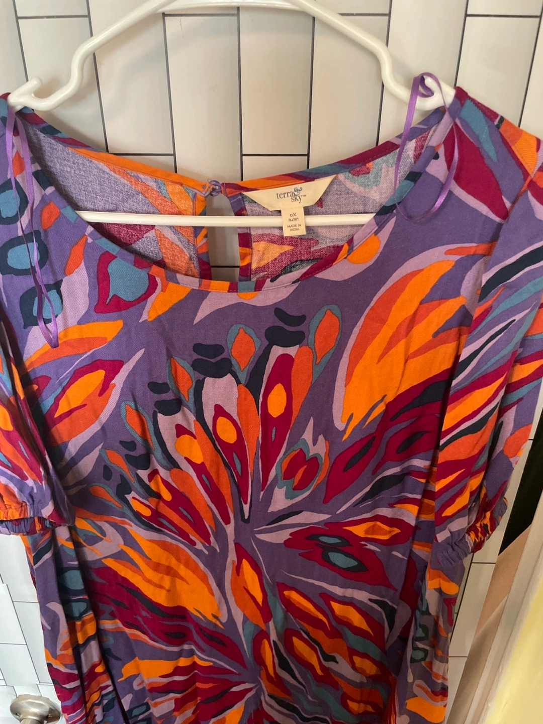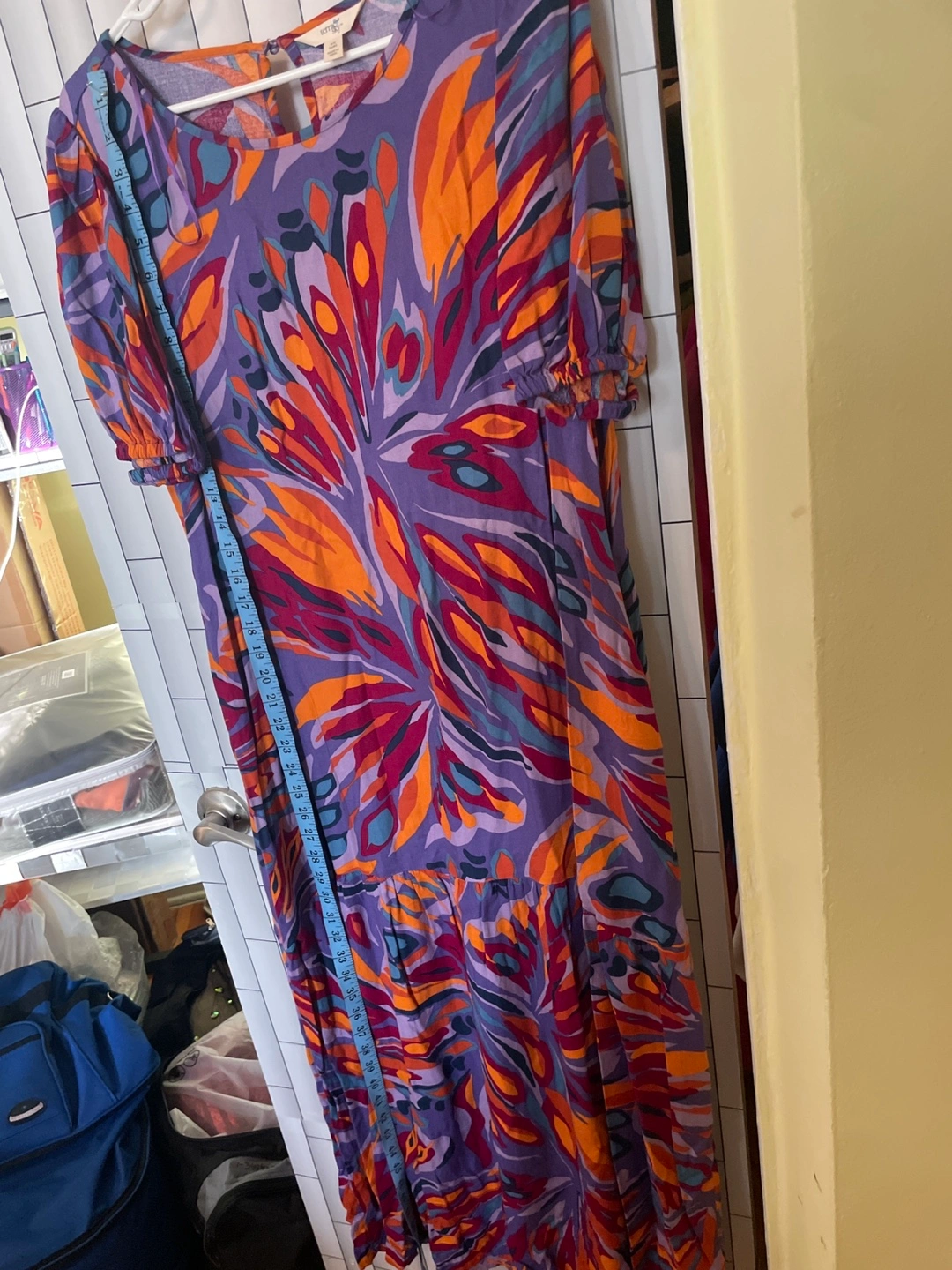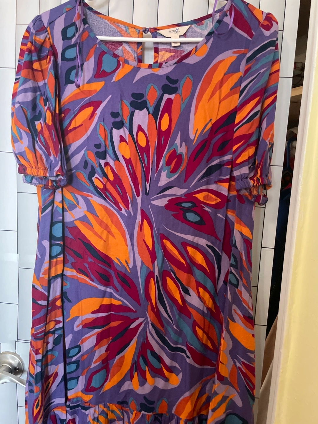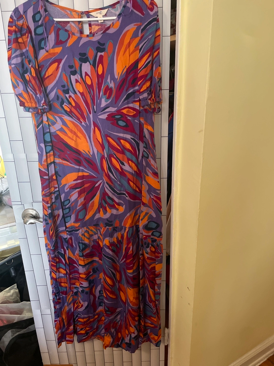 Women's size large maxi dress. Abstract print, short sleeves, tiered skirt. Keyhole back detail. Flowy and comfortable. Very good condition gentle wear only a few times.