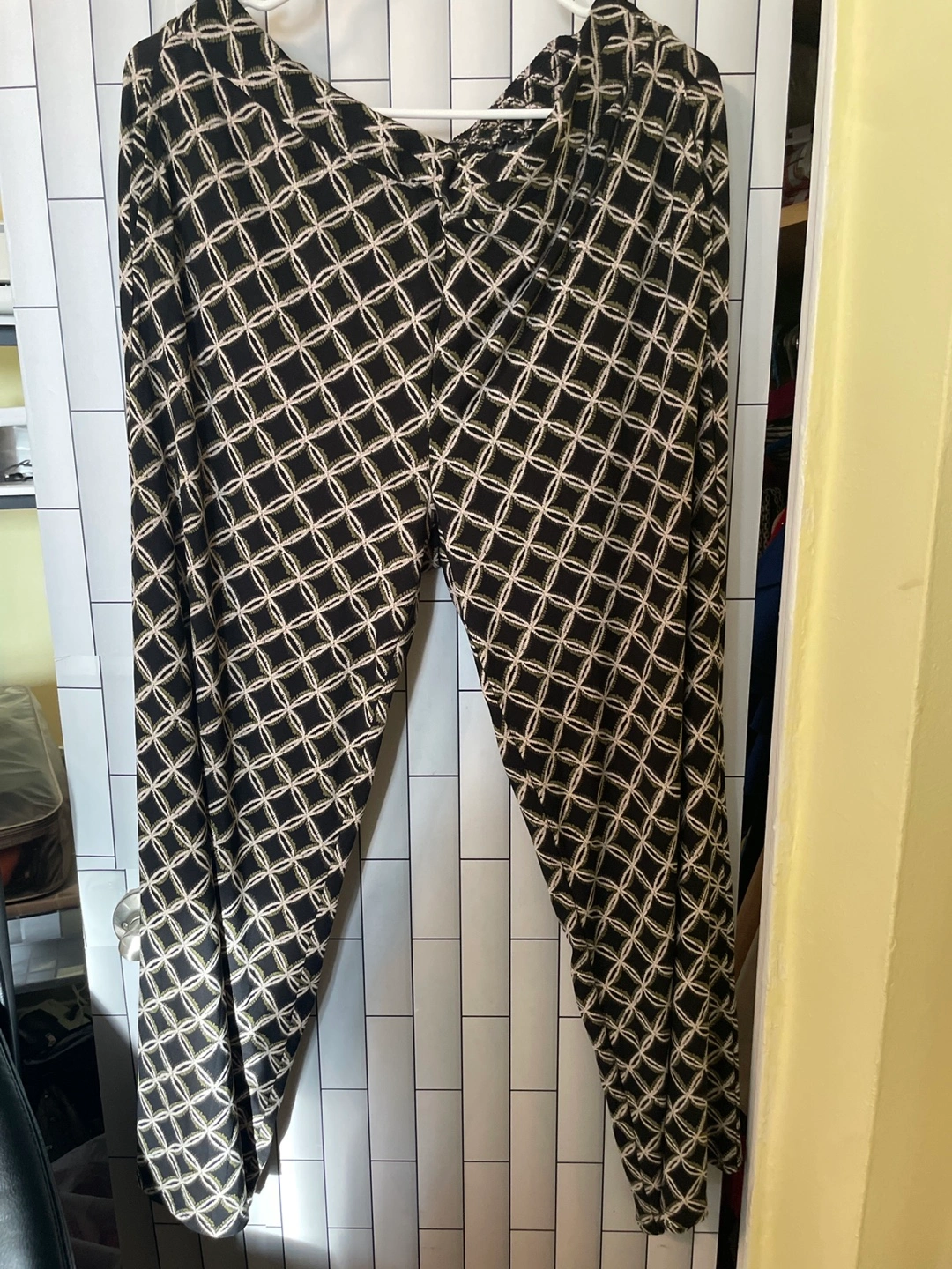 Women's sleeveless top and pants set. Geometric pattern, black, green, and white. Size M. Elastic materials. Very good condition gentle wear only a few times.