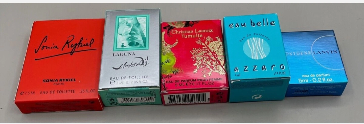 Set of six miniature perfume bottles. Various brands and scents. Great for collectors or travel. Includes Sonia Rykiel, Laguna, Christian Lacroix Tumulte, Azzaro Eau Belle, and Oxygene Lanvin.