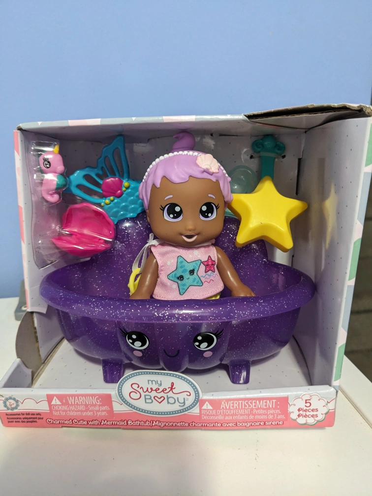 Adorable doll with purple hair in a sparkly purple bathtub. Includes accessories like a starfish, seashell, and a mermaid tail comb. Suitable for ages 3+