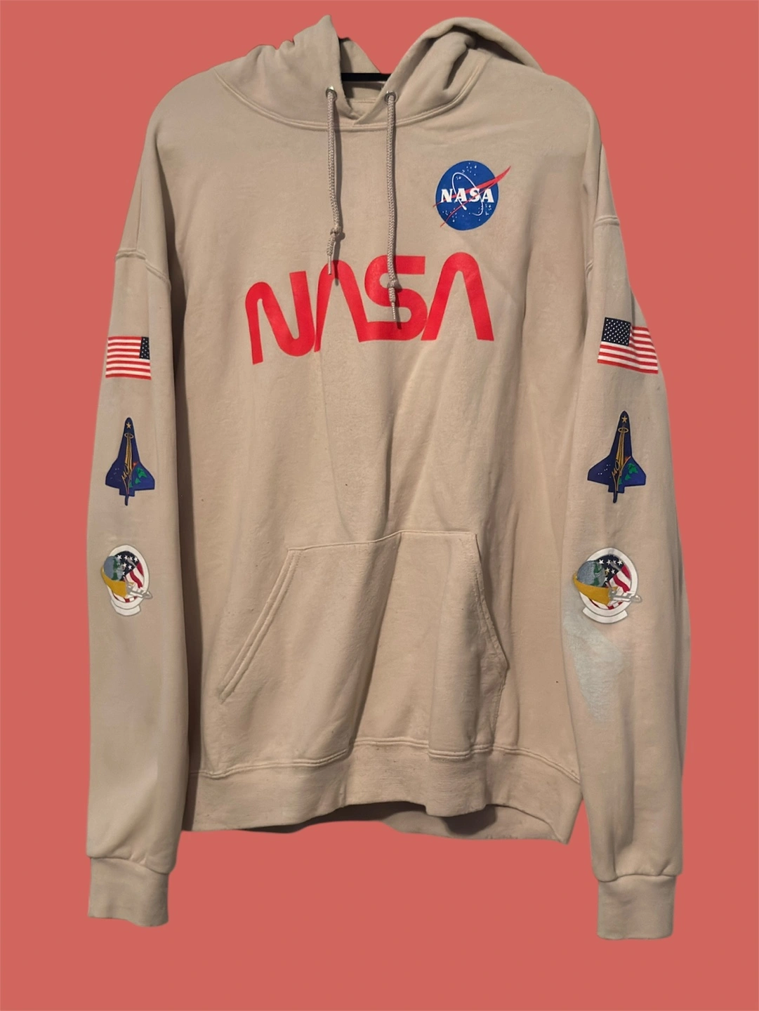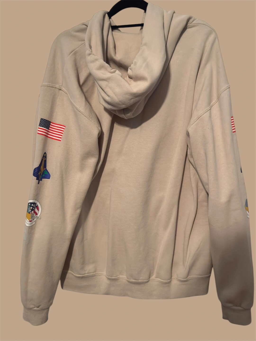 Men's large NASA-themed hoodie. Thrifted this a while ago on Depop trying to get rid of it. Features NASA logo and space shuttle graphics. Beige color. 50% cotton, 50% polyester. BUY THIS AND GET THE NEXT TWO HOODIES FOR 5
