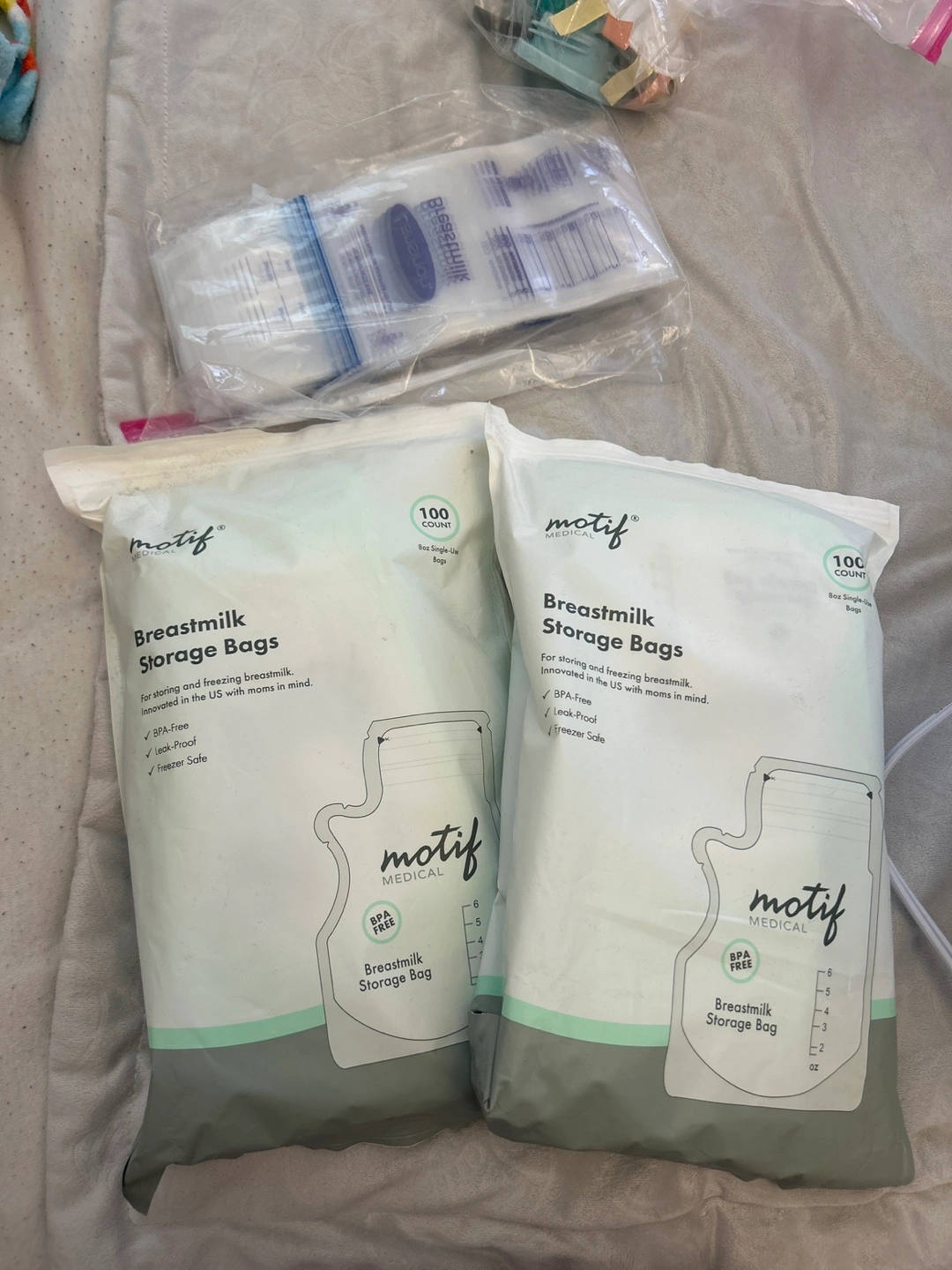 Two 100-count packages of Motif Medical breastmilk storage bags. BPA-free, leak-proof, and freezer-safe. Perfect for storing and freezing breastmilk.